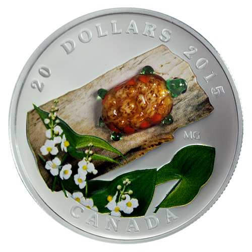 2015 $20 FINE SILVER COIN VENETIAN GLASS TURTLE WITH BROADLEAF ARROWHEAD FLOWER