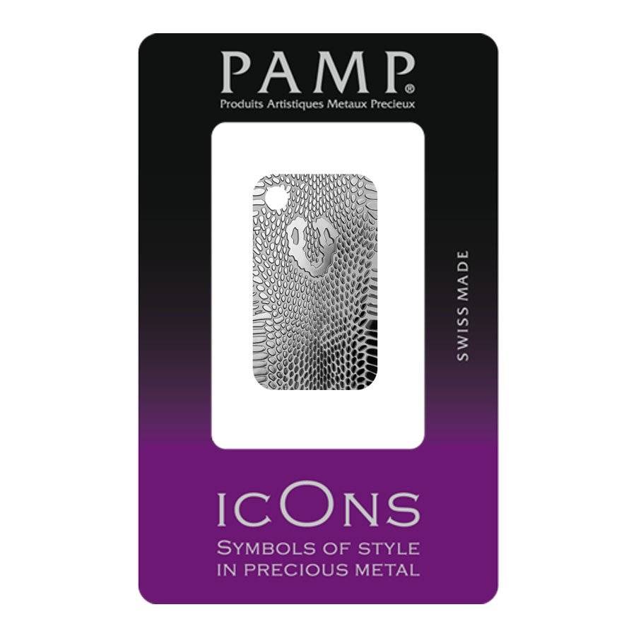 Discover your wild side with this breathtaking Cobra SKIN Silver Pendant, made from .999 find silver. It is meticulously crafted from .999 fine silver, featuring an imitation of the beautiful Cobra snake skin, coupled with an imprint of the infamous cobra face. Your product comes with the ingot pendant in a redesigned PAMP packaging, with lush purple silk and a pouch so you can store on the go. It also includes an informative booklet that details PAMP’s impressive history as one of the premier silver and gold dealers in the world. The pouch, which features gorgeous purple silk details, also includes a sturdy and durable black necklace to hang our pendant. Not feeling the black necklace? No problem. Give us a call to book an appointment so you can take a look at our exclusive chains, fit for every budget and style.