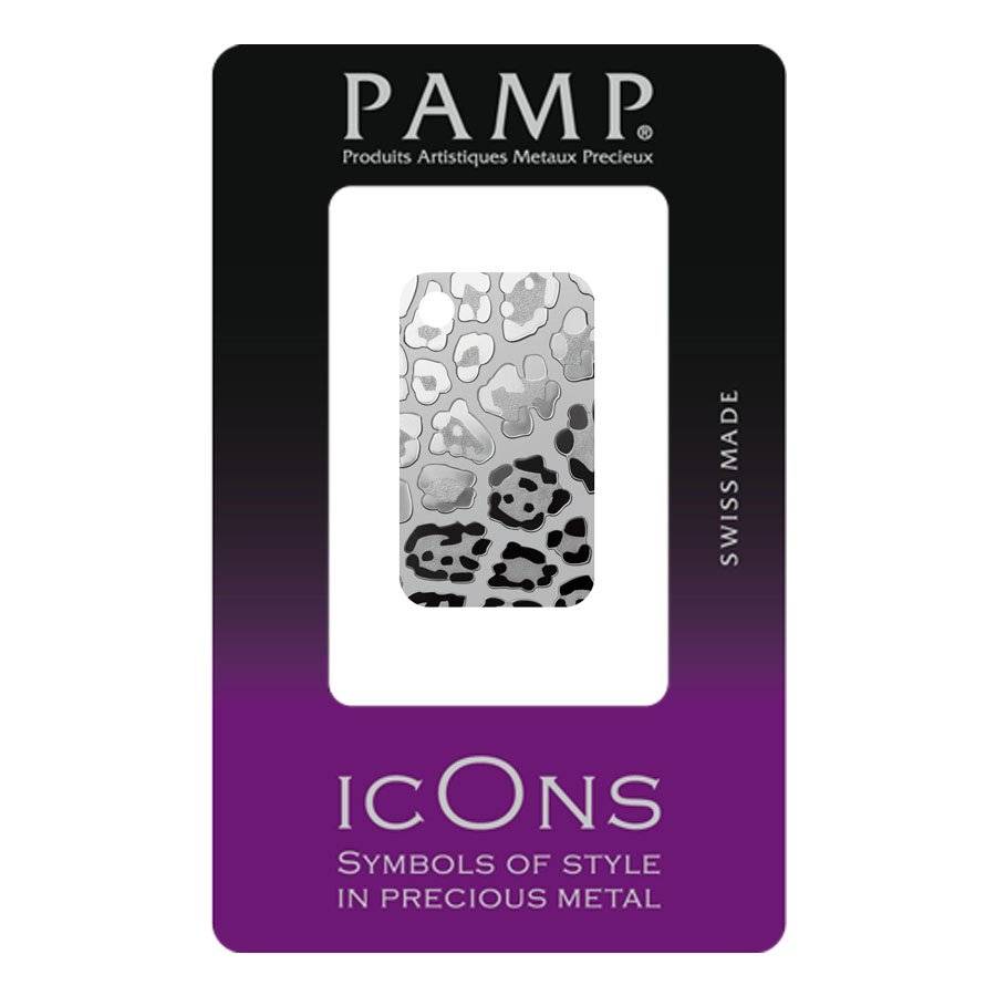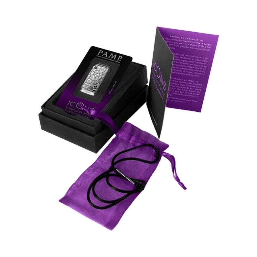 Discover your wild side with this breathtaking Leopard SKIN Silver Pendant, made from .999 find silver. It is meticulously crafted from .999 fine silver, featuring an imitation of a beautiful Leopard texture. Your product comes with the ingot pendant in a redesigned PAMP packaging, with lush purple silk and a pouch so you can store on the go. It also includes an informative booklet that details PAMP’s impressive history as one of the premier silver and gold dealers in the world. The pouch, which features gorgeous purple silk details, also includes a sturdy and durable black necklace to hang our pendant. Not feeling the black necklace? No problem. Give us a call to book an appointment so you can take a look at our exclusive chains, fit for every budget and style.