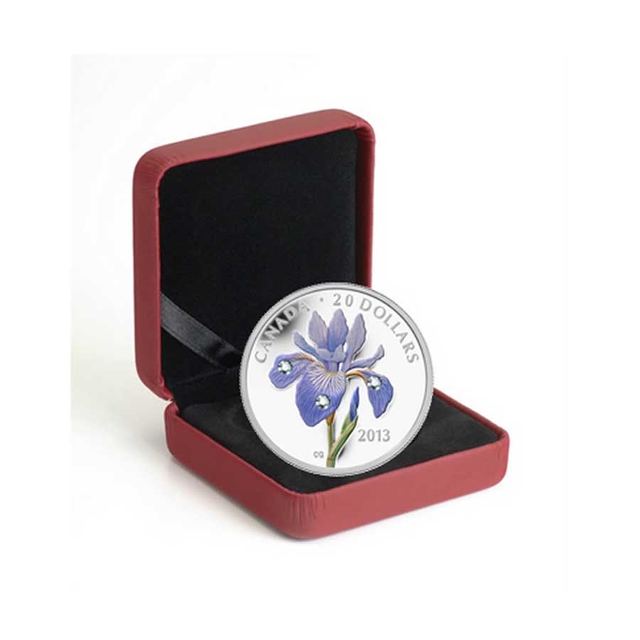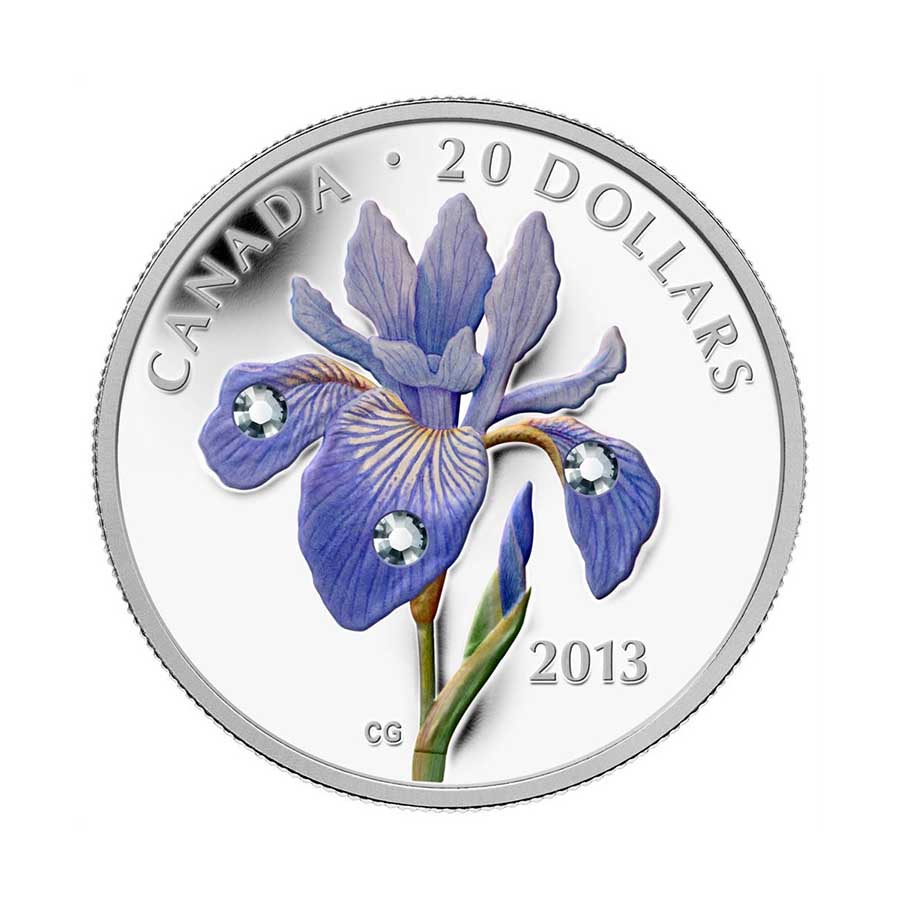 The Blue Flag Iris opens to the morning sun, dotted with glittering Swarovski crystal dewdrops are featured in this popular Royal Canadian Mint series of fine silver coins.