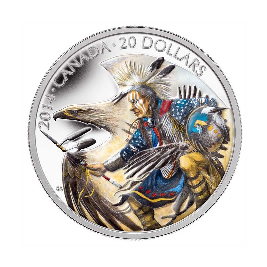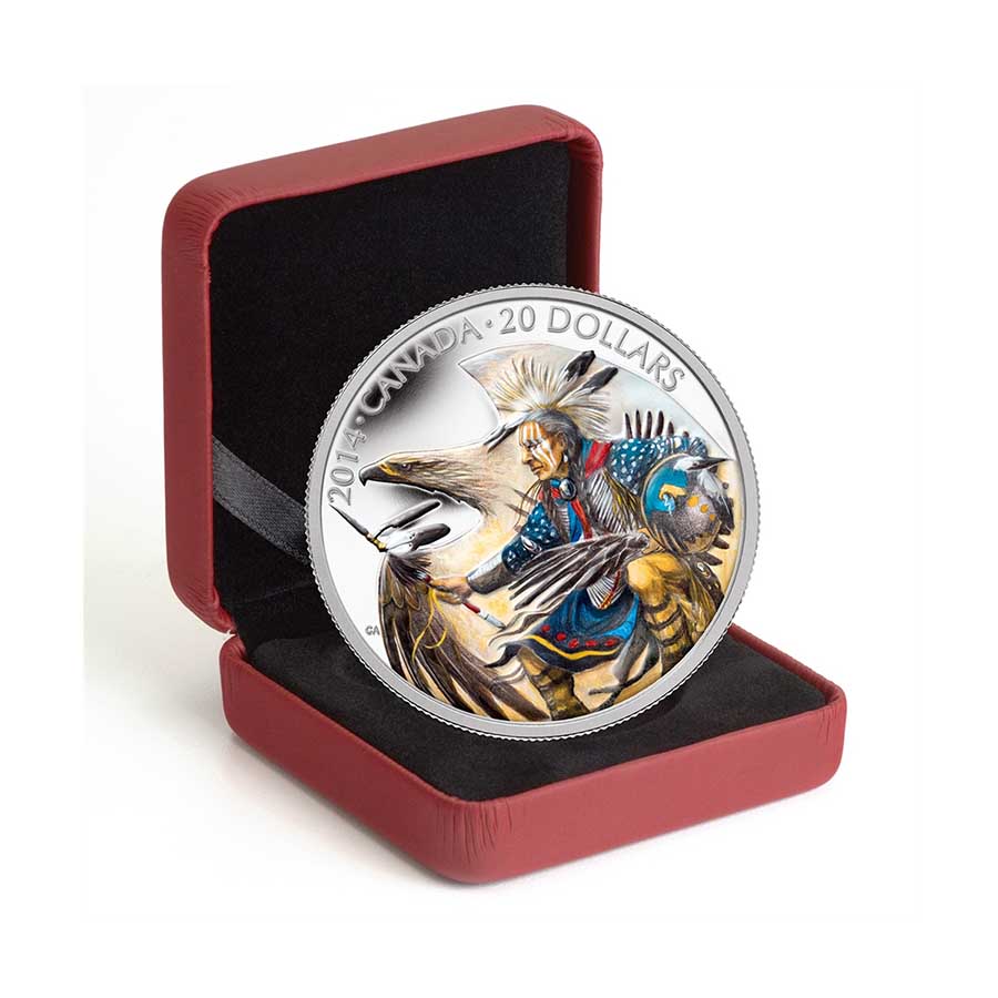 This one ounce fine silver coin honours the long-standing tradition of First Nations story-telling; it is part of a series of coins celebrating Nanaboozhoo, a legendary figure in Ojibwa folklore. Nanaboozhoo is a shape-shifting spirit (often taking on the form of a rabbit) that is prominently featured in Aboriginal story-telling, including the story of the world’s creation. Folkloric tales tell us that Nanaboozhoo was first sent to earth to teach the Ojibwa; his first task was to name all of the plants and animals. The highly-detailed, beautifully rendered and brightly coloured image by Ojibwa artist Cyril Assiniboine shows Nanaboozhoo in profile, alongside the fearsome Thunderbird, a mythical beast in First Nations folklore that lives in the opening of the clouds in the sky. According to one legend, Nanaboozhoo turns himself into a rabbit and is swiftly carried up to the nest of the Thunderbirds in order to retrieve their feathers, which would make his hunting arrow very powerful. He steals these feathers from the young Thunderbirds while the parents are out hunting and returns to the earth, very much hurt from his high jump. When the older Thunderbirds learn of this deceit (Nanaboozhoo has been defined as a “trickster” figure in First Nations folklore) they chase him across the land, but he takes cover within the hollow trunk of a birch tree. When the Thunderbirds eventually give up on their pursuit, Nanaboozhoo escapes and declares the birch tree a protector and benefactor of the human race. Today, you can still see the short black marks on birch tree bark made by the angry claws of the Thunderbirds; this is also why lightning never strikes a birch tree. This coin, struck with proof-finish in 99.99% pure silver, is part of a collection of five coins that chronicle the legend of Nanaboozhoo. This coin would make a fantastic addition to any collection of precious coins, or as a gift to any First Nations folklore enthusiast.