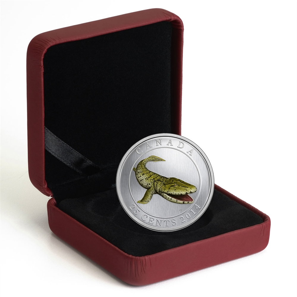 About 2014 25C PREHISTORIC CREATURES: TIKTAALIK - GLOW-IN-THE-DARK COLOURED COIN [127627]