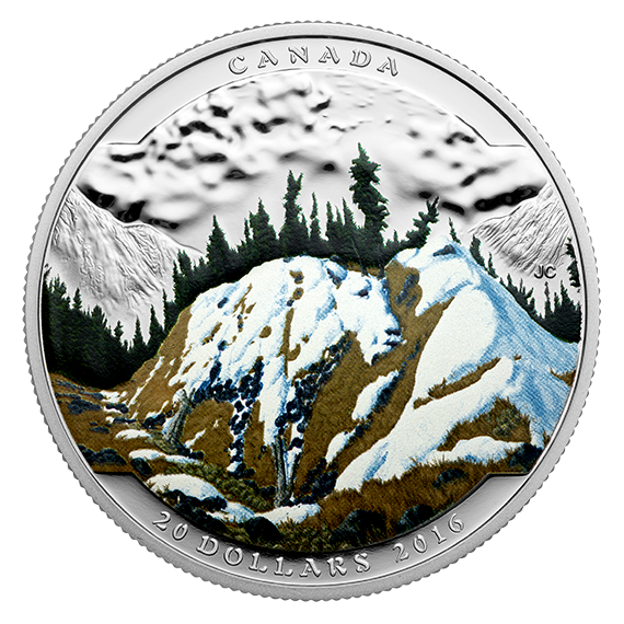 Designed by Canadian artist Julius Csotonyi, your coin features an alpine scene beautifully crafted in colour. It is late spring and some lingering snow still covers the ground. Mountains rise to the left and right while a ridge of moraine from retreating glaciers dominates the centre of the scene. The ancient mound has long been reclaimed by nature, and is now covered with grass and spruce trees, but on closer examination, a mountain goat emerges from its sloping side. The goat’s body is shaped by melting snow and exposed stone, while the trunks of wind-worn spruce trees stand as its legs and horns.