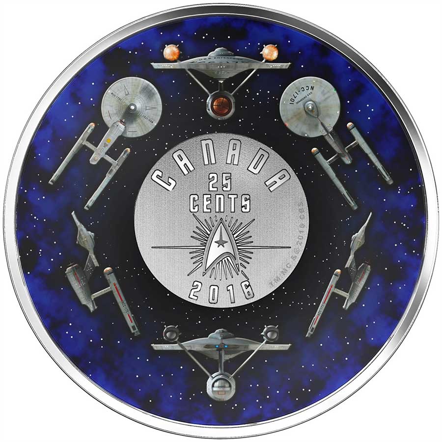 Your coin design combines detailed engraving with vibrant colour application for a colourful ode to the legacy of the U.S.S. Enterprise (NCC-1701). Outer space serves as the dark background in the wide outer ring, while a rich blue colour recreates the gaseous appearance of a nebula cloud. Positioned in a circle, six different views of the Enterprise allow the viewer to examine the vessel’s features from every angle: overhead, underside, bow, aft, starboard and portside. In the engraved-only centre is the distinctive arrowhead-shaped Starfleet insignia, with the word “CANADA”, the face value “25 CENTS” and the year “2016” engraved alongside it in a special Star Trek font.