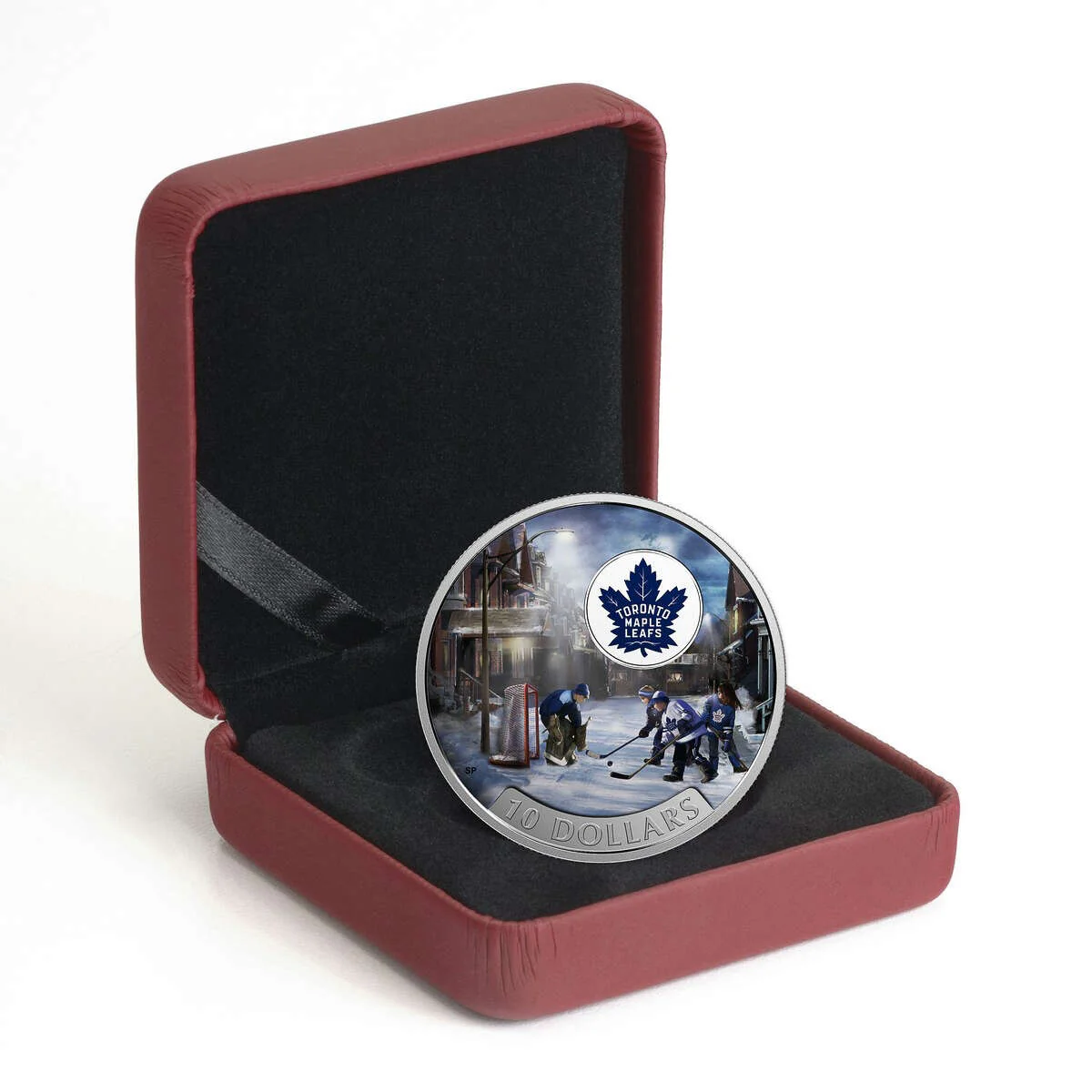 Renowned Canadian artist Silvia Pecota captures the vibrant energy of a neighborhood street hockey game. The full-color design, set against finely engraved details, depicts four young enthusiasts in Toronto Maple Leafs® winter gear, engrossed in a spirited match beneath the soft glow of a streetlight. Breath visible in the crisp winter air, players charge toward the puck, racing to outmaneuver the goalie. Modern cars in the background add a contemporary touch to this classic scene, evoking nostalgia and the enduring essence of the game. Above, the iconic blue-and-white Maple Leafs® logo crowns the dynamic composition.