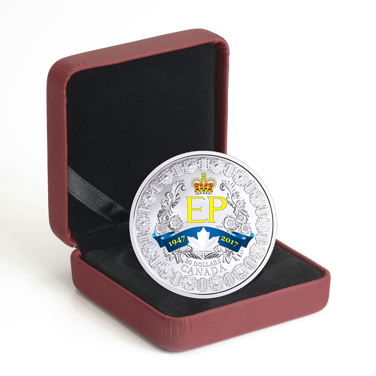 Designed by Canadian artist Derek Wicks, the reverse coin design artfully combines symbolic elements to express Canada’s well wishes to Her Majesty Queen Elizabeth II, Queen of Canada, and His Royal Highness Prince Philip, Duke of Edinburgh, on their 70th wedding anniversary. A colour application over detailed engraving places a special emphasis on the Royal Cypher (EP) and St. Edward’s Crown; both are flanked by decorative scrollwork that comes together in the shape of a tiara, with a prominent maple leaf to pay tribute to the Canadian Crown. The vibrant blue hue of the garter sash provides a colourful backdrop for the engraved double dates “1947” and “2017” that mark this Royal Platinum Anniversary. Fittingly, the geometric motif encircling the design is inspired by Her Majesty’s platinum-set bracelet, which was gifted to her by His Royal Highness on their wedding day (November 20, 1947). This artistic rendering of the Royal jewel is further enhanced by lustre colour technology, which evokes the scintillating beauty of diamonds and adds a regal sparkle to our numismatic celebration.