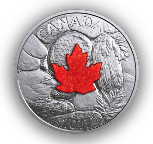 The reverse design by Canadian artist Lisa Thomson-Khan captures a quiet moment in nature, with an image that inspires quiet reflection and a stirring of pride. A sparkling, red-coloured drusy stone is positioned at the centre, where its maple leaf-shaped outline immediately catches the eye. Carried by the autumn breeze, this maple leaf has come to rest on the ground, where a scattering of engraved maple leaves lie among the various shaped rocks and stones. The crystal-encrusted stone sparkles in the natural light, while the use of multiple finishes throughout the engraved backdrop ensures no detail will go unnoticed. The reverse includes the engraved word “CANADA” and the year “2017”. The obverse features the effigy of Her Majesty Queen Elizabeth II by Susanna Blunt.