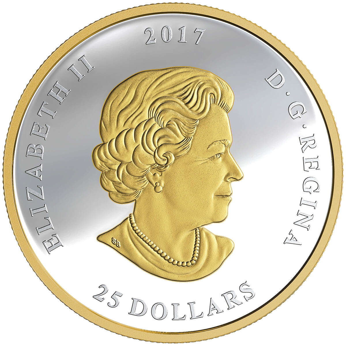 The obverse features the gold-plated effigy of Her Majesty Queen Elizabeth II by Susanna Blunt, along with the engraved word “CANADA”, the face value “25 DOLLARS” and the year “2017”.