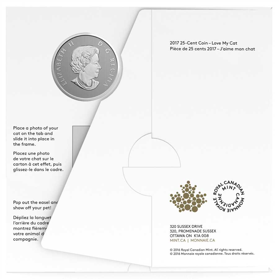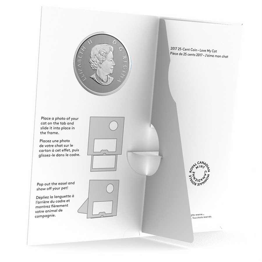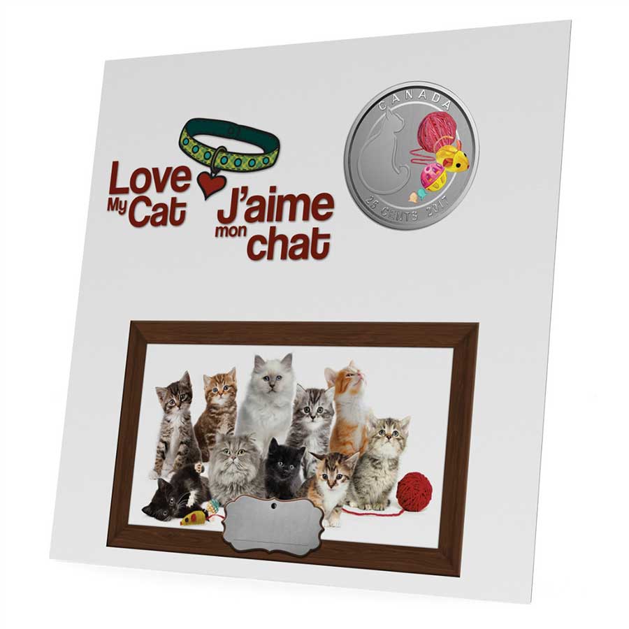 Your coin’s design combines engraved and coloured elements in a loving tribute to the pet cats that play a large role in the lives of so many Canadians. On the left is the raised and engraved silhouette of cat in a seated position, its tail wrapped around itself as it faces right.