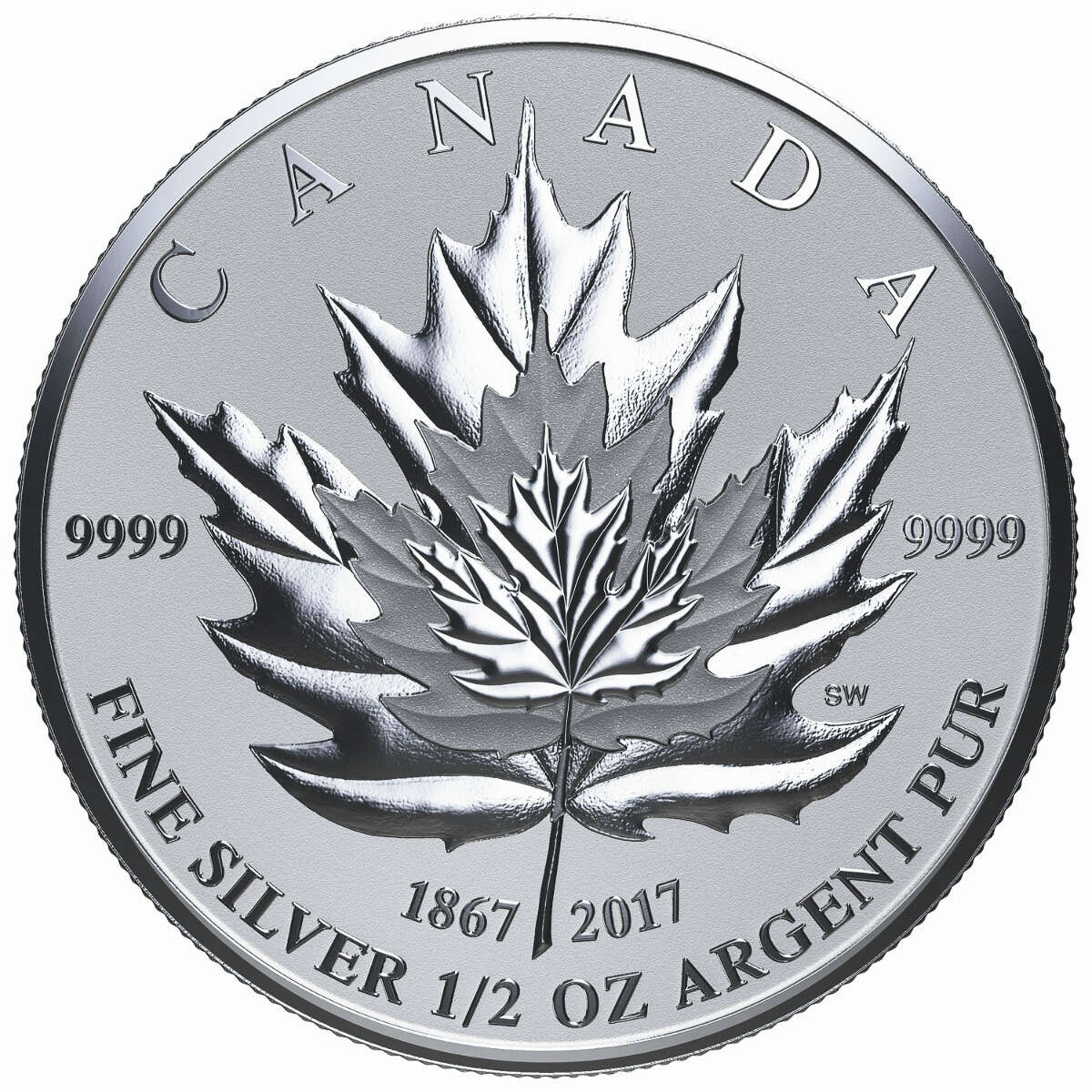 Stan Witten, a Canadian artist and senior engraver at the Royal Canadian Mint, has created an overlay design of three silver maple leaves, each leaf becoming progressively smaller and selectively enhanced with its own distinctive finish. The leaves are from the silver maple and are executed in a timeless, classical style with a unique double-date (1867-2017) flanking the stalk of the largest leaf.
