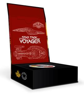 The reverse features a rich application of vibrant colour that captures the imaginative spirit behind Star Trek: Voyager and the entire Star Trek universe. The underside view of U.S.S. Voyager NCC-74656 highlights the more pointed shape of its saucer hull and the unusual angle of its warp nacelles in flight. While a multi-coloured, glow-in-the-dark nebula and a ringed planet provide an otherworldly backdrop, a blue glow draws the eyes towards the starship’s navigational deflector; its rounded shape is similar to the two that have been incorporated in the frame, which also bears the engraved words “STAR TREK” and “CANADA” in a Star Trek font. The obverse features the effigy of Her Majesty Queen Elizabeth II by Susanna Blunt.