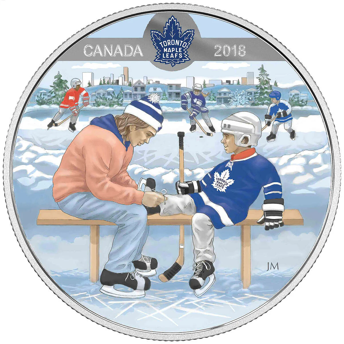 The reverse, designed by renowned Canadian artist John Mantha, features the vibrant Toronto Maple Leafs® team logo above an outdoor hockey rink. The touching illustration depicts a parent and child preparing for a game, embodying the essence of Canadian winter traditions. The obverse showcases Susanna Blunt’s elegant effigy of Her Majesty Queen Elizabeth II.