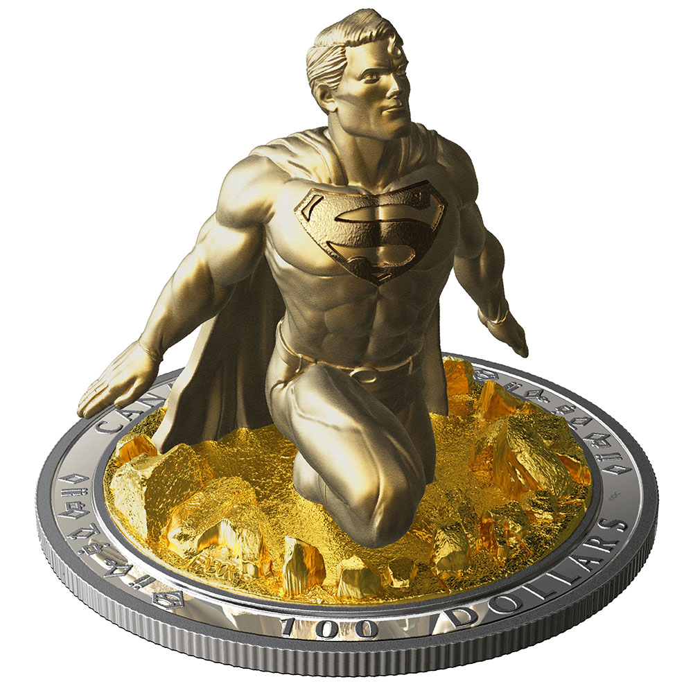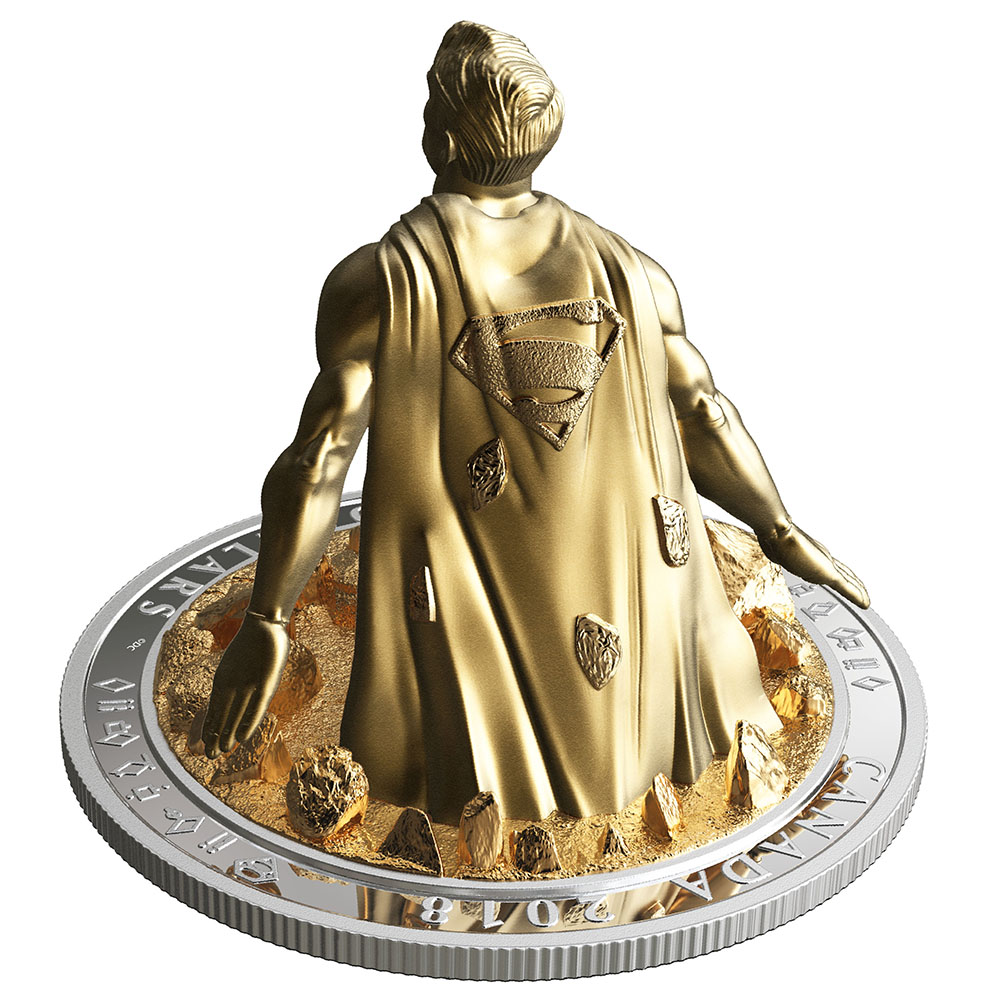 - Magnificent gold plating adds a rich gleam to the silver sculpture of Superman, whose show of strength on the reverse may have been fuelled by Earth’s yellow sun.