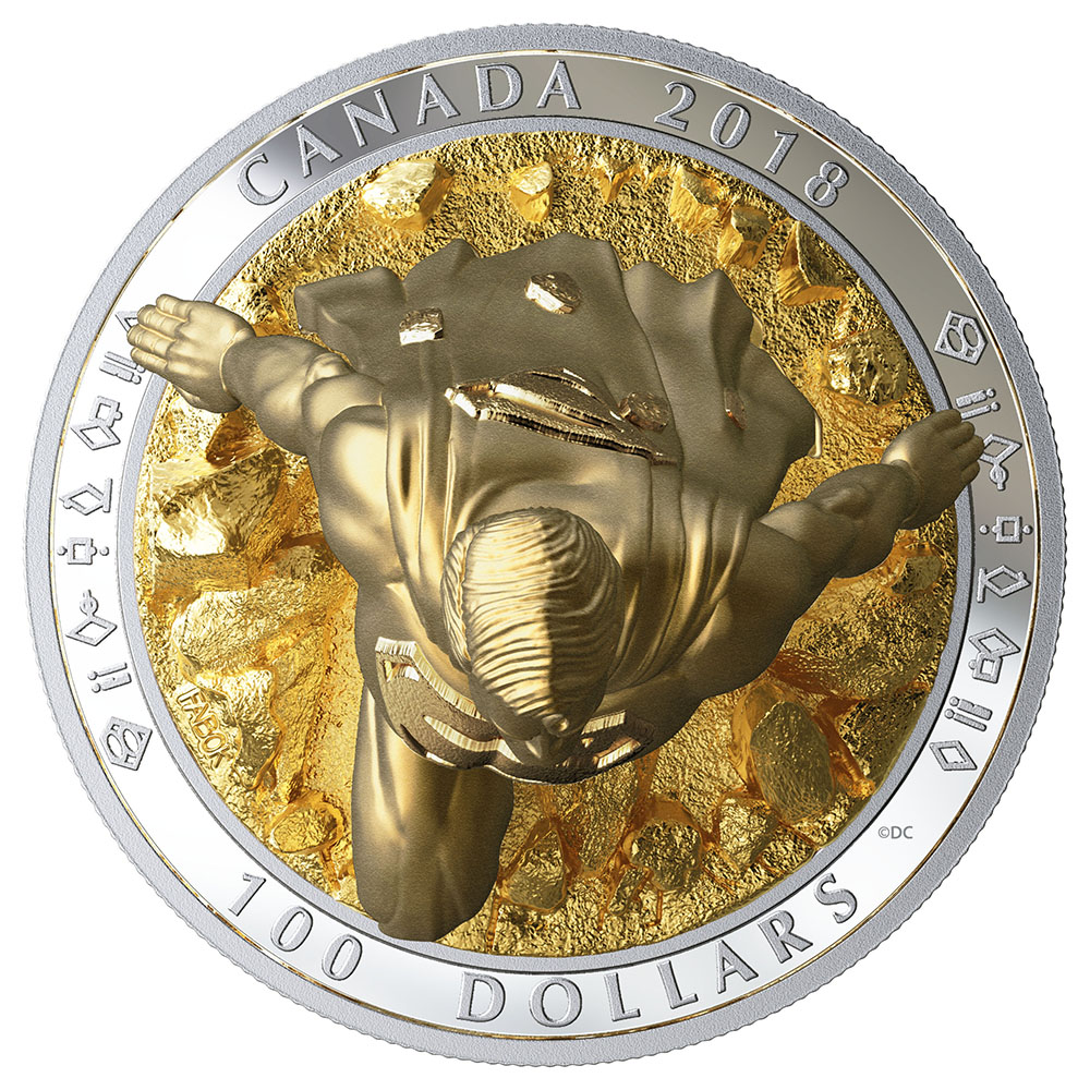 Designed by Canadian comic book artist Jason Fabok, the reverse offers a statuesque take on The Last Son of Krypton. The silver sculpture of Superman appears to break out of the coin’s surface, where the boundary between 2D and 3D art has been “shattered” in a show of strength and resolve. As though exposed to the energy-giving rays of Earth’s yellow sun, Superman basks in the rich gleam of gold plating that highlights the sculpted work of Royal Canadian Mint engraver Matthew Porter. Superman’s gaze looks up towards the sky as he ascends with arms held out to the side, providing an unfettered view of the iconic ‘S’ emblazoned across his chest. The coin’s flat surface serves as a base, where the framed rim includes the engraved Kryptonian glyphs for “SUPERMAN” alongside the word “CANADA”, the year “2018” and the face value, “100 DOLLARS”. The obverse features the effigy of Her Majesty Queen Elizabeth II by Susanna Blunt and the word “CANADA”.95