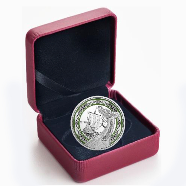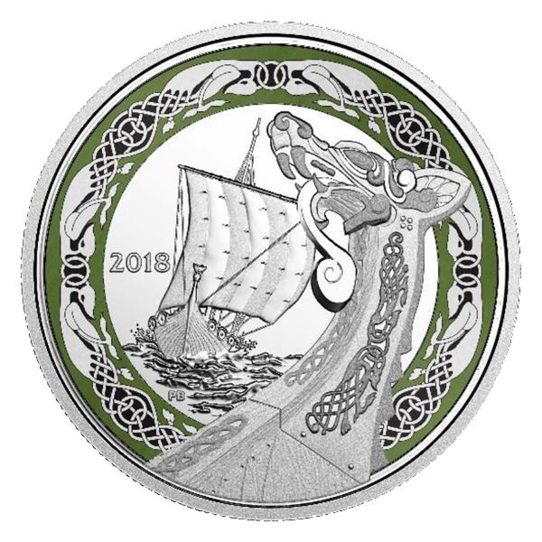 The reverse design by Patrick Belanger presents an artistic rendering of the dragon-headed longship (drakkar), which was regarded as a symbol of Viking power and strength. The background features a precisely engraved depiction of the wooden vessel in open waters, where the wind fills its square sail and propels it forward during a long-distance journey. A troop carrier fit for rulers and chieftains, this ornate longship is equipped with shields while its curved bow rises up towards a dragonhead prow ornament, whose purpose was to ward off evil spirits and sea monsters. Selective colour over engraving emphasizes the elaborate nature of the carved figurehead in the foreground, which offers a magnified view of this feature that gave the Norse vessel its name and added to the ship’s imposing appearance. The side view of the figurehead overlaps a green-coloured frame inspired by Norse art elements, including traditional knotwork with an integrated gripping beast motif that also adorns the Norse figurehead. The obverse features the effigy of Her Majesty Queen Elizabeth II by Susanna Blunt.