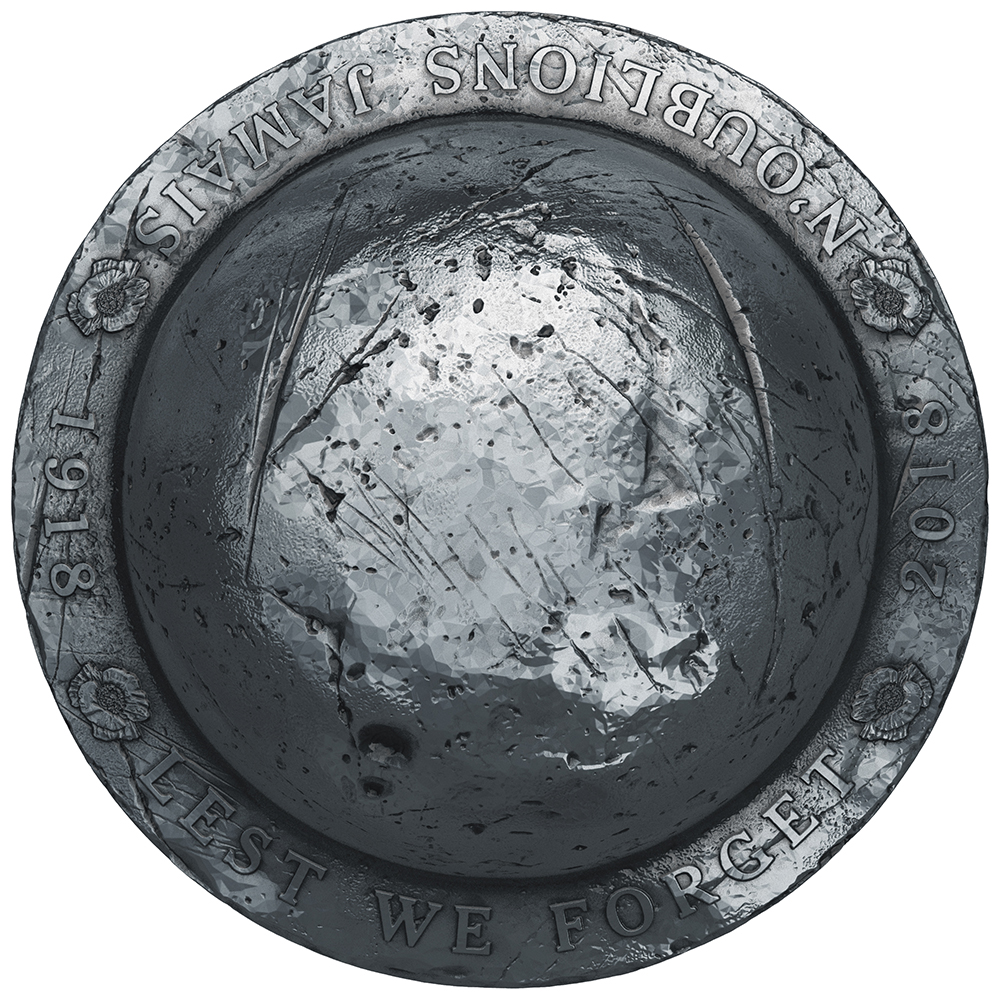 Resembling the 1916 Mark I model worn by Canadian combatants, the combat helmet-shaped coin is the result of a careful collaboration between Royal Canadian Mint engravers and engineers. The coin’s unprecedented, extreme curvature allows for a realistic re-creation (on a much smaller scale) of the bowl-shaped headgear issued to Canadian troops and all British Empire forces in 1916. The reverse provides a view of the top of the now-iconic steel helmet, whose battle-worn appearance is the result of engraved “cracks” and “markings” beneath the antique finish that gives it all a distressed look. Along the brim that helped protect soldiers from airborne debris, the heartfelt assurance “LEST WE FORGET N’OUBLIONS JAMAIS” is flanked by engraved poppies, while the double dates “1918” and “2018” mark the centennial of Armistice. The obverse features the effigy of Her Majesty Queen Elizabeth II by Susanna Blunt engraved deep in the recessed circular crown, while the legend and face value are engraved on the brim.