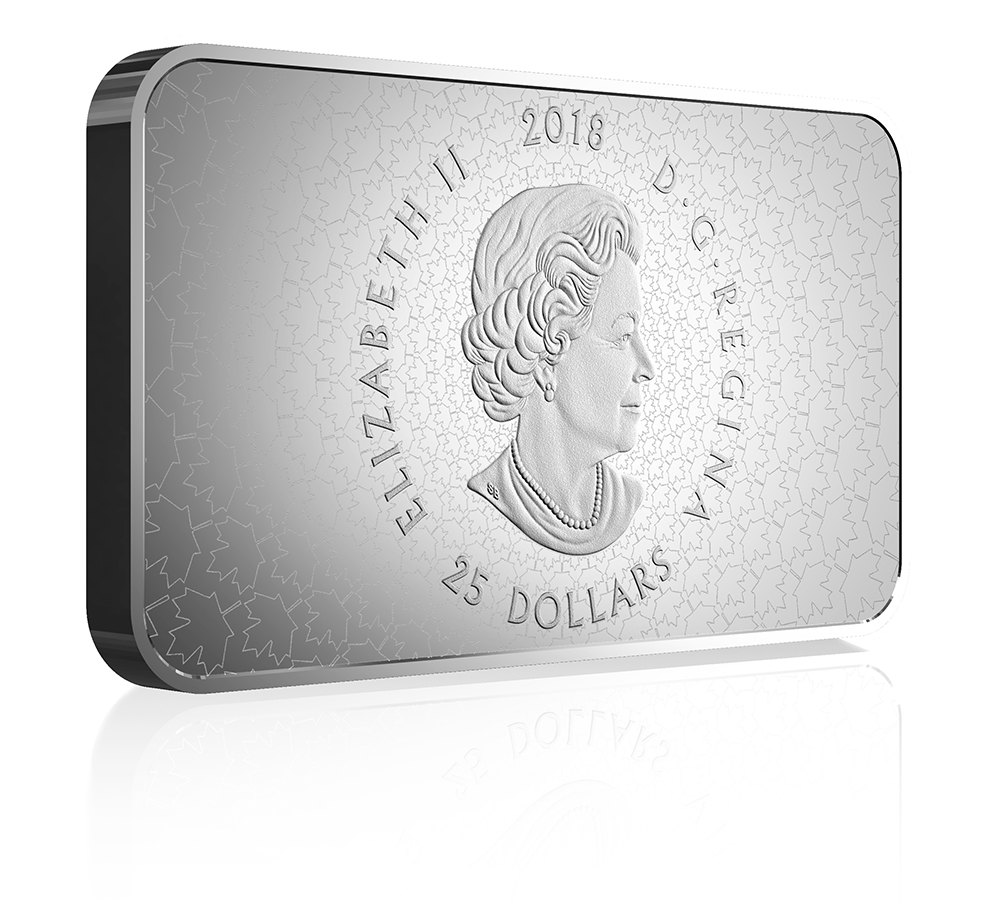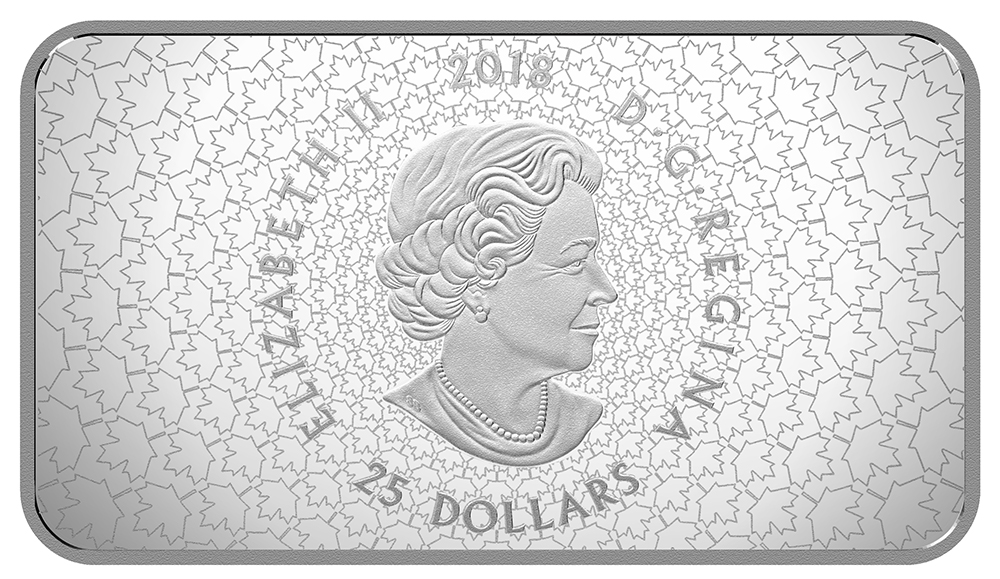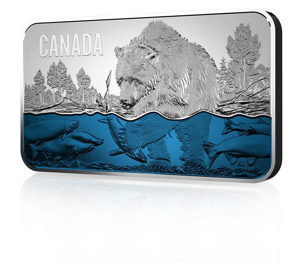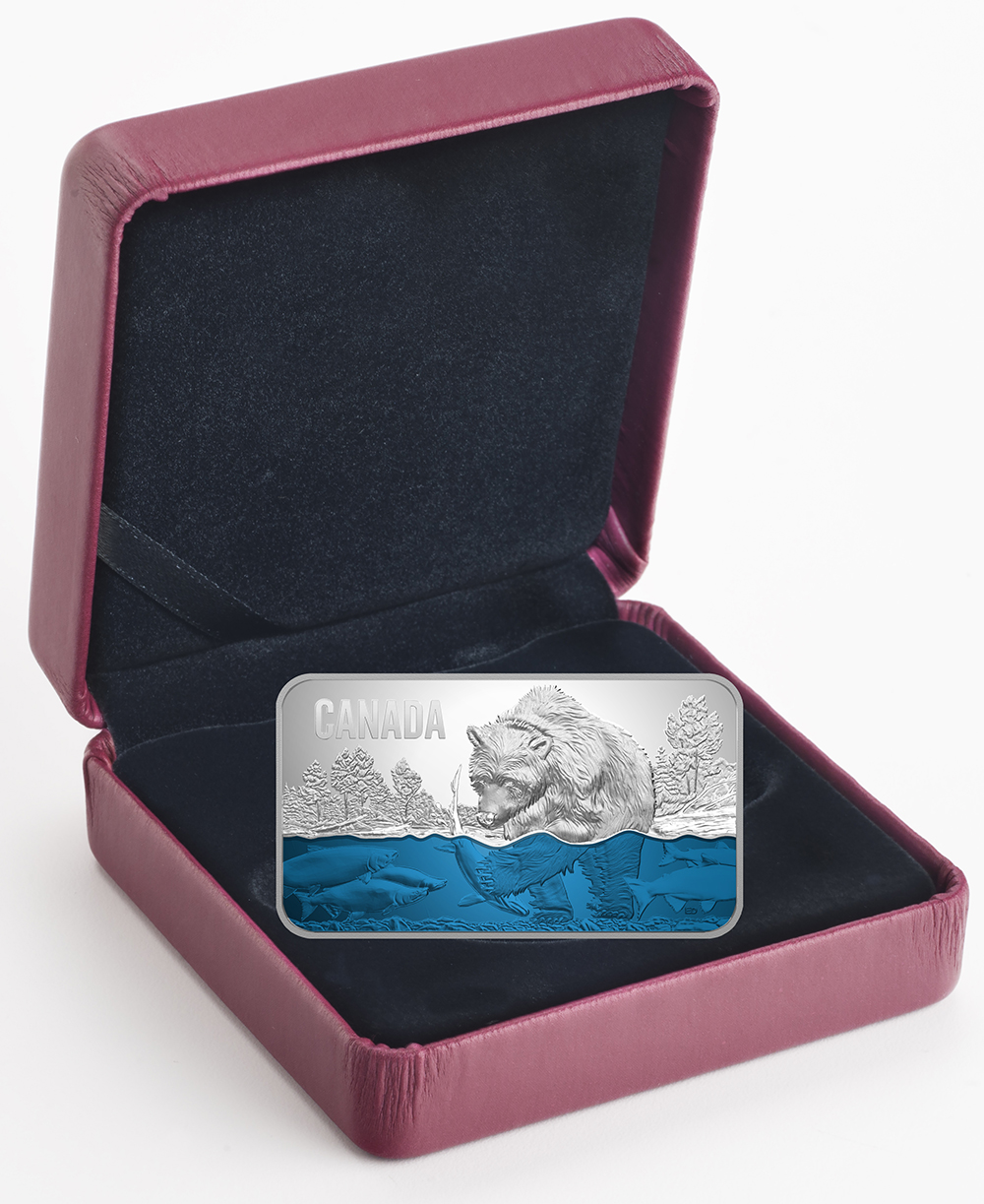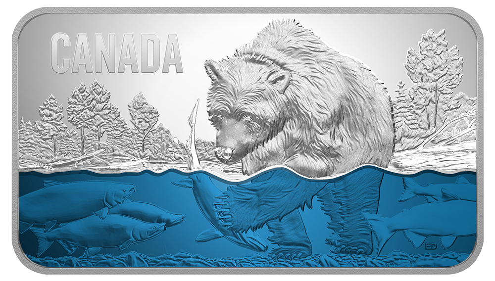 The reverse image by Emily Damstra features a river setting in Western Canada, where the annual sockeye salmon run is underway. Translucent colour enamel adds a beautiful blue hue to the water while allowing an underwater view of the engraved sockeye salmon (Oncorhynchus nerka) and the gravel-ined riverbed. Engraved in ultra high relief to heighten its imposing stature, a grizzly bear (Ursos arctos) has waded into the shallow water to catch its real. The split-shot nature of the design is a reminder of the salmon’s crucial role in this ecosystem, whether sustaining other wildlife or providing marine-derived nutrients that support plant life. The reverse includes the engraved word “CANADA”. The obverse features the face value “25 DOLLARS”, the year “2018” and the effigy of Her Majesty Queen Elizabeth II by Susanna Blunt.
