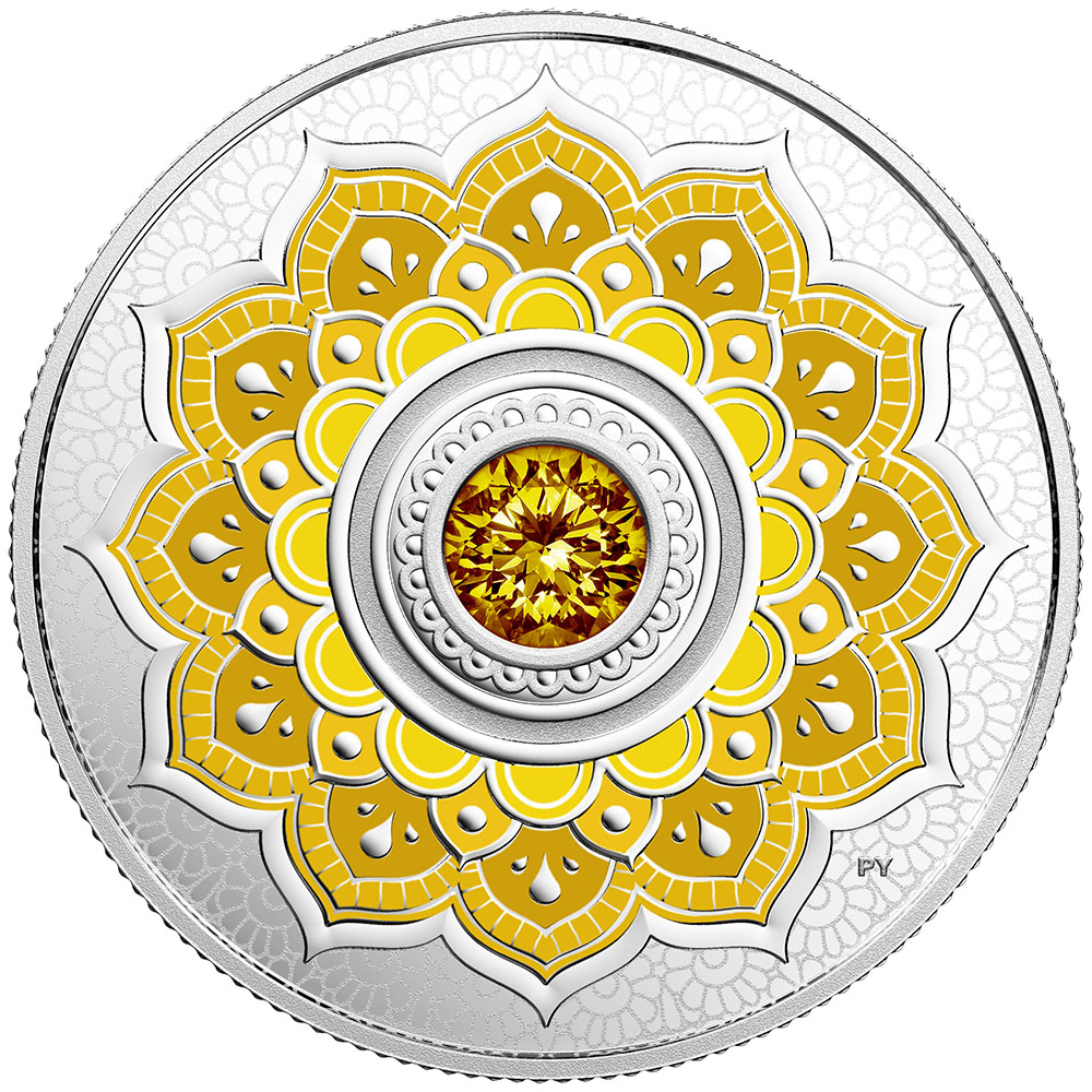 The reverse by Pandora Young presents a cross-cultural celebration inspired by the ancient tradition of Indian mehndi. A symmetrical arrangement of highly ornate shapes and symbols form a 12-point radial pattern that reflects the calendar year. A prominent henna motif — the lotus — is among the finely detailed elements that emanate from the centre, where a colourful Swarovski® crystal represents the November birthstone, topaz. A selective application of colour complements the stone, while the playful contrast between soft and vivid tones highlights the layered complexity of the engraved artistry. The obverse features the effigy of Her Majesty Queen Elizabeth II by Susanna Blunt.
