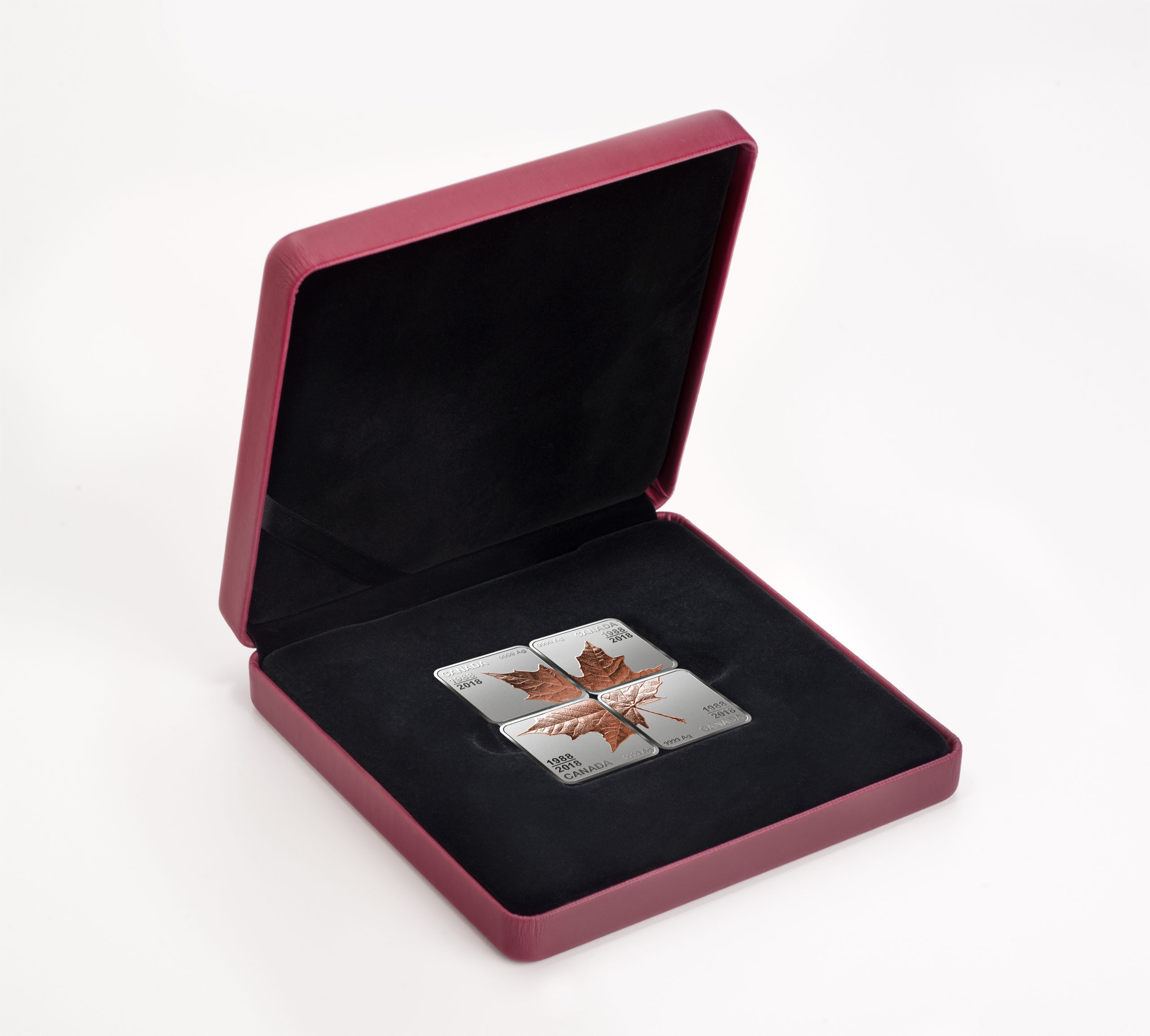 This quartet pays tribute to 30 years of history through its creative take on the idea of a fractional set. Each of the four fine silver coins is square-shaped, and features a “fraction” of a reverse design by Canadian artist Pierre Leduc. When placed together to form a larger square, the four reverse images come together as one: a sugar maple leaf (Acer saccharum), whose likeness has graced the reverse of the Royal Canadian Mint’s Silver Maple Leaf (SML) bullion coin since 1988. A reverse proof finish and selective rose gold plating colourfully enhance the elegance and brilliance of the engraved leaf, which is near life-like thanks to the precise rendering of fine details such as the leaf’s deeply etched veins. Also engraved on the reverse are the commemorative years “1988” and “2018”, the word “CANADA”, and a “9999 Ag” purity notation. The obverse features the rose gold-plated effigy of Her Majesty Queen Elizabeth II by Susanna Blunt.