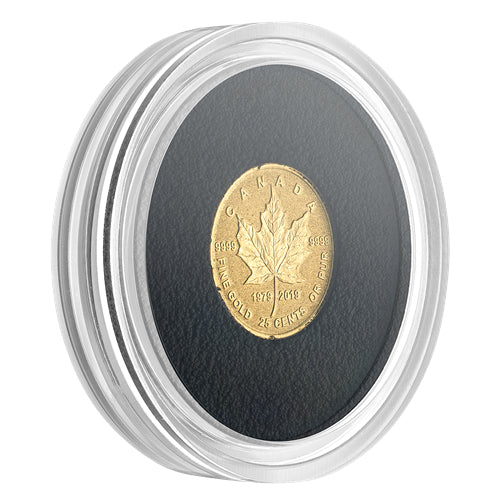 The reverse of this exquisite coin showcases Walter Ott’s iconic maple leaf design, first introduced on the original Gold Maple Leaf bullion coin in 1979. The intricate engraving of the sugar maple leaf captures every fine detail, despite the coin’s compact size. The reverse also features the inscriptions “CANADA,” “FINE GOLD 25 CENTS OR PUR,” the purity standard “9999,” and the commemorative double date “1979-2019.” The obverse side bears the effigy of Her Majesty Queen Elizabeth II, designed by Susanna Blunt.