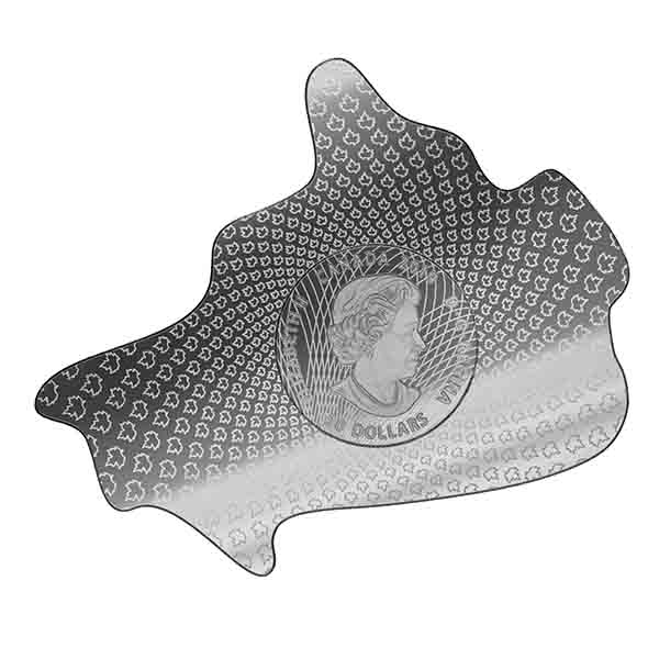 A patriotic FIRST: Be the first to own a Canada-shaped coin! This 99.99% pure silver coin features a unique shape that follows the contour of our map of Canada on the reverse.