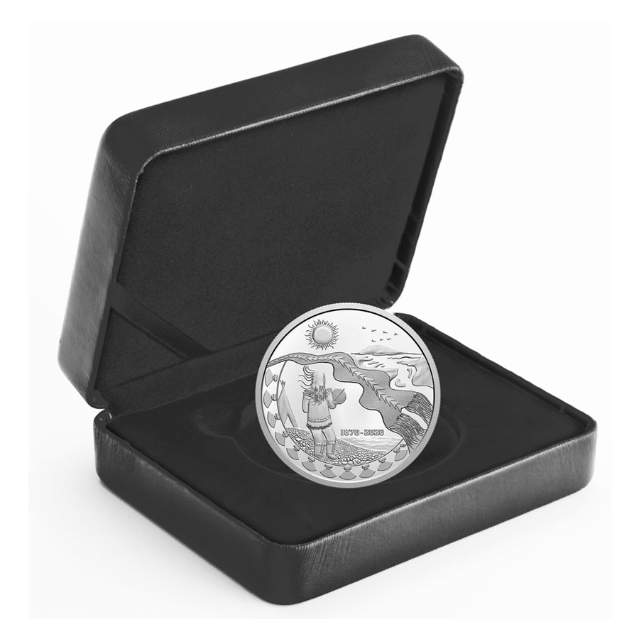 This 2 oz. fine silver coin commemorates the 150th anniversary of the Northwest Territories’ entry into Confederation. Its reverse design is an artistic expression of pride for the territory’s medley of cultures, and for the land that has sustained its inhabitants since time immemorial.