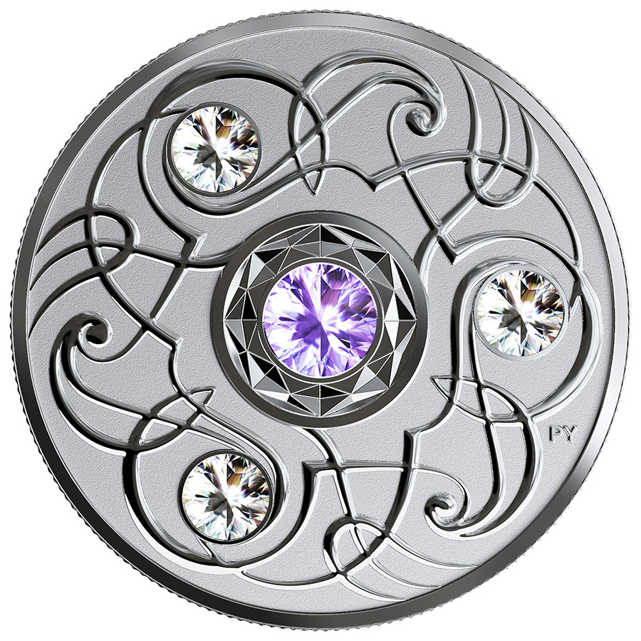 - Four Swarovski® crystals are embedded on this coin: three small clear ones within the engraved pattern, and a larger one that adds more colourful sparkle than the actual birthstone.