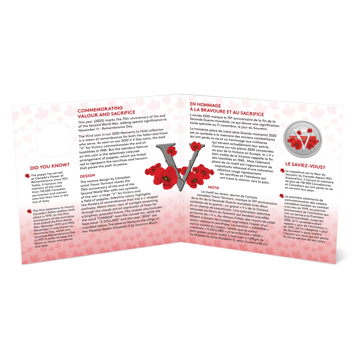 The reverse design by Canadian artist Trevor Tennant marks the 75th anniversary of the end of the Second World War with two symbols of the war: a large “V” for Victory and a field of poppies. Selective colour highlights the flowers of remembrance that line a v-shaped pathway. Above them, rays of sunlight streaming through the clouds are an expression of hope for a brighter, peaceful future. The reverse also includes the word “CANADA” near the curved rim, while the face value “5 DOLLARS” and the year “2020” are inscribed below. The obverse features the effigy of Her Majesty Queen Elizabeth II by Susanna Blunt.