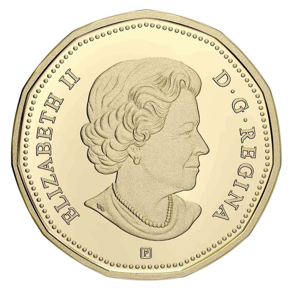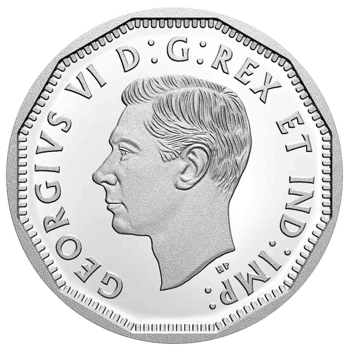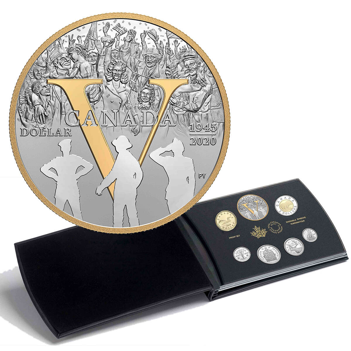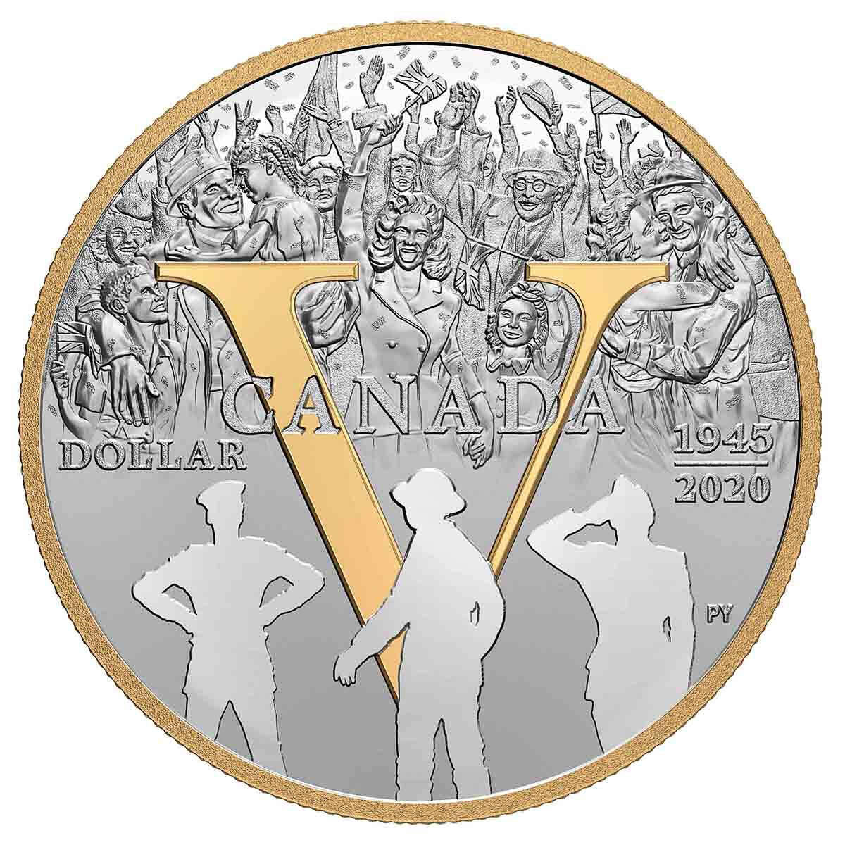 The proof silver dollar design features a selectively gold-plated “V” for Victory dominates the reverse design by artist Pandora Young. The crowd represents jubilation on the home front on May 8, 1945, a day when Canadians poured into streets and public places to celebrate Victory in Eu rope (V-E) Day. The spontaneous celebration gradually fades behind the “V” to become a scene of remembrance, with three silhouettes representing the different branches (navy, army and air force) of the Canadian and British Armed Forces in which Canadians and Newfoundlanders served. The obverse features the effigy of King George VI by T. H. Paget and a Victory privy mark.