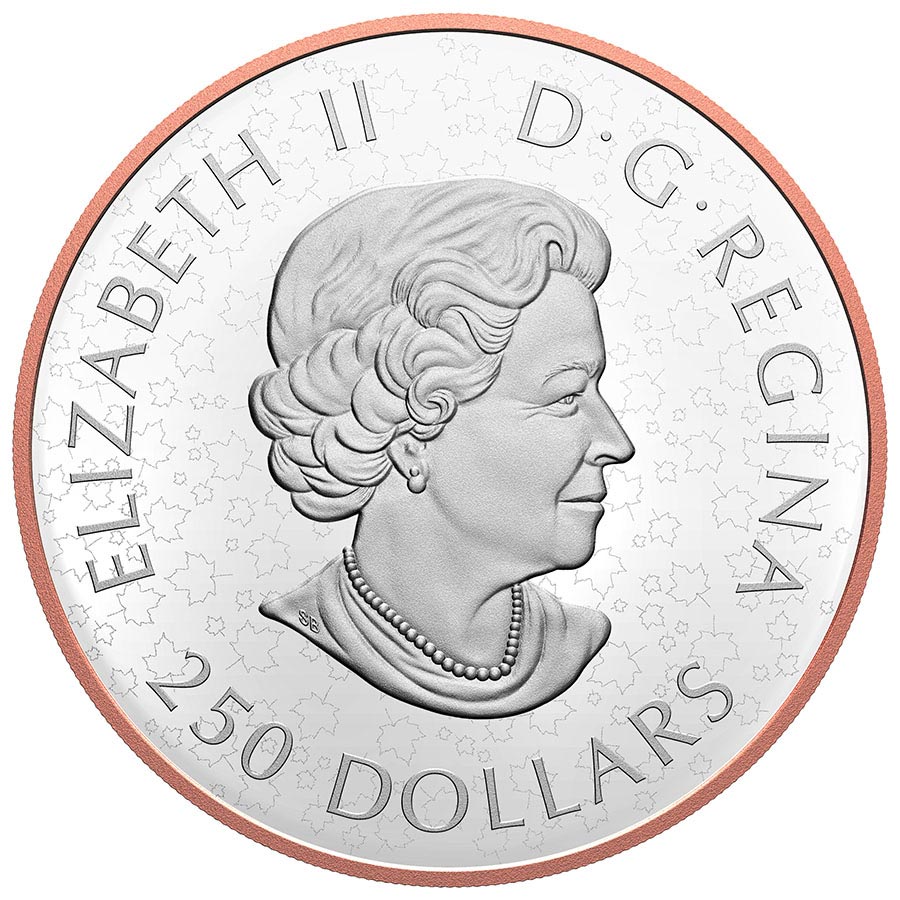 OBV: The effigy of Her Majesty Queen Elizabeth by Susanna Blunt with “ELIZABETH II D.G. REGINA” and “250 DOLLARS” engraved around the circumference of the coin. The maple species featured on the reverse also appears on the obverse as a background pattern.