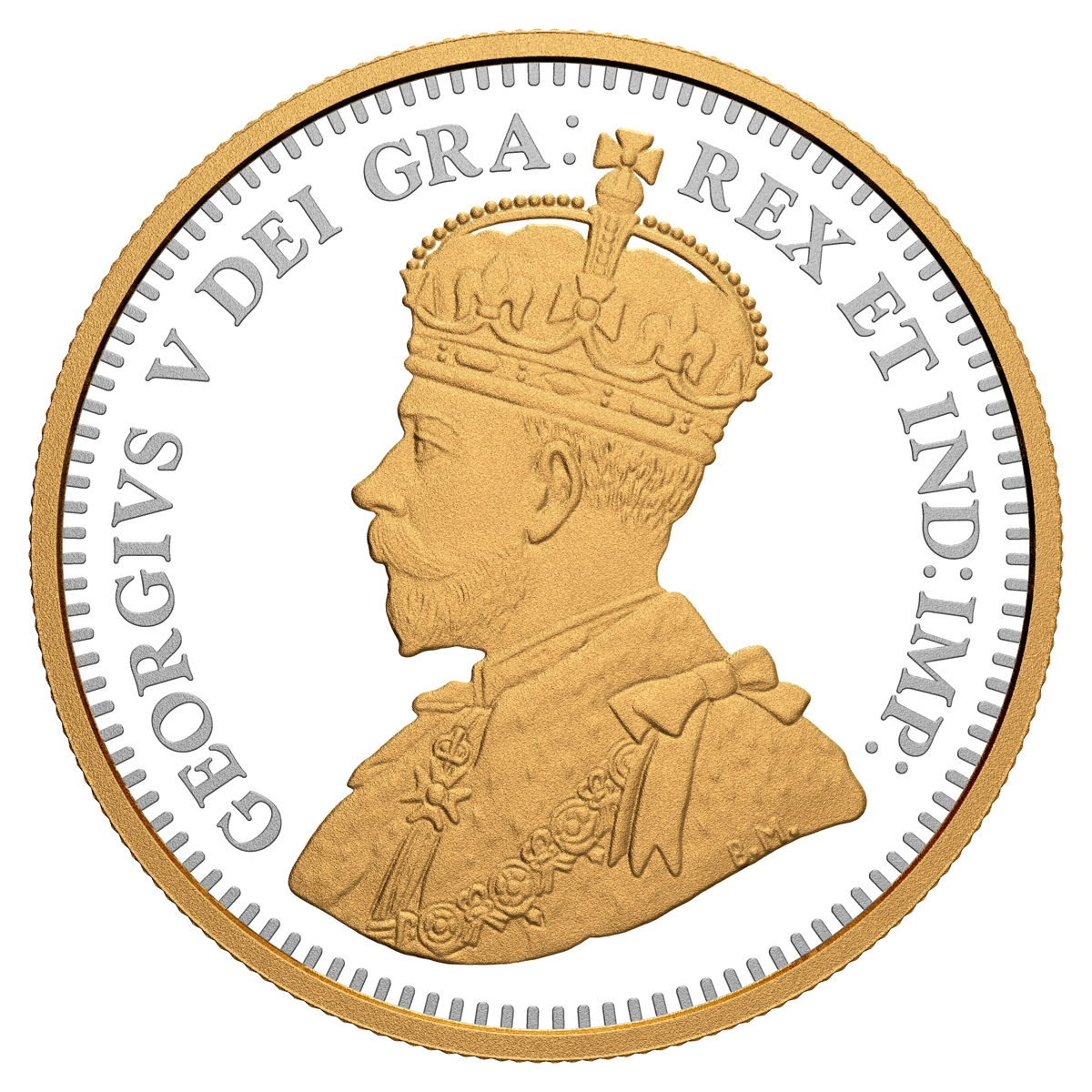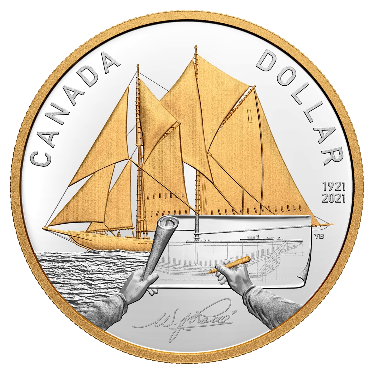 Designed by Canadian marine artist Yves Bérubé, your coin’s reverse travels back in time to see naval architect William James Roué (1879-1970) completing his design for the legendary Bluenose schooner. The first-person perspective is flat frosted to distinguish between Roué’s vision and the inspiring sight of a selectively gold-plated Bluenose under full sail. As an added tribute, W.J. Roué’s signature is included, as it appeared on the original Bluenose sail plan. The obverse features the effigy of King George V by Sir E. B. MacKennal. Learn more about Canada’s best-known naval architect and designer of our national icon.