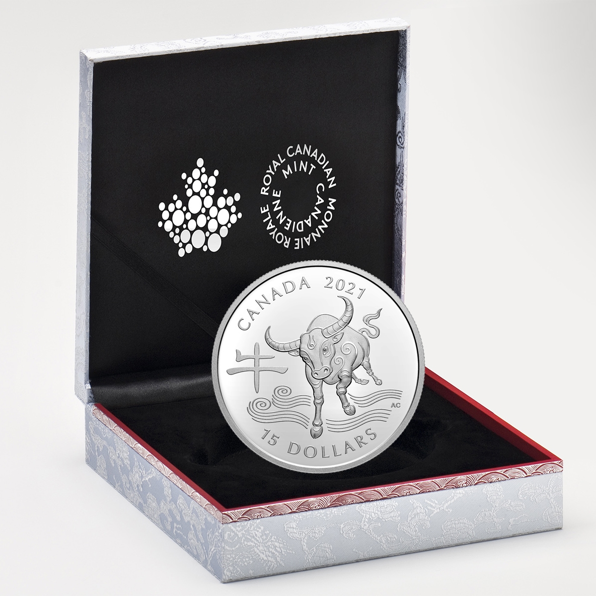 Canadian Three Degrees Creative Group has portrayed the powerful Ox gently bowing its head beneath a branch of peach blossoms to reveal its kind and benevolent nature. To the right, the Chinese character for “Ox” is engraved within a square that has been selectively coloured in red to symbolize good luck. The obverse features the effigy of Her Majesty Queen Elizabeth II by Susanna Blunt.