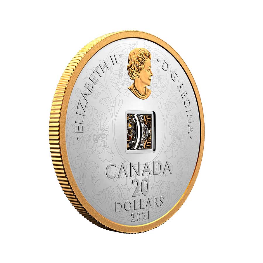On your coin’s reverse, the engraved design by Canadian artist Anna Bucciarelli features a selectively gold-plated arrangement of irises, peonies and acanthus leaves. The patented Dancing DiamondTM mount allows for a Canadian-sourced FIRE AND ICETM diamond to be set within an open circle at the centre of the coin, where it catches the light with every movement. This diamond centrepiece is nestled among gold-plated peony stamens and surrounded by spring-themed filigree details, such as butterflies and flowers. The obverse features the selectively gold-plated effigy of Her Majesty Queen Elizabeth II by Susanna Blunt, as well as the text “CANADA”, the face value of “20 DOLLARS”, and the date “2021”.