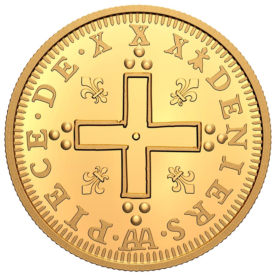 The 30-denier coin of the French regime was dubbed the “mousquetaire” because of its cross, which resembled the emblem of the king’s musketeers. Three centuries later, that famous cross has been made new again on the reverse of this 99.99% pure gold collector’s item! We’ve gone to great lengths to capture all the details of the original design from the 1700s. But you can judge for yourself, because your 24-karat gold collectible comes with a genuine 30-denier coin, which instantly evokes images of life in New France.