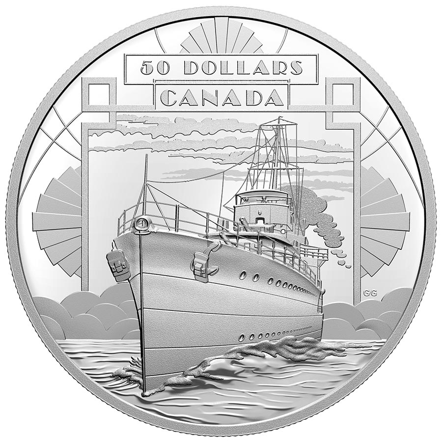 Our journey through history continues! Coin #2 in the First 100 Years of Confederation is an art deco-styled view of Canada from 1914 and 1945 and features one of the first ships built for the Royal Canadian Navy (RCN).