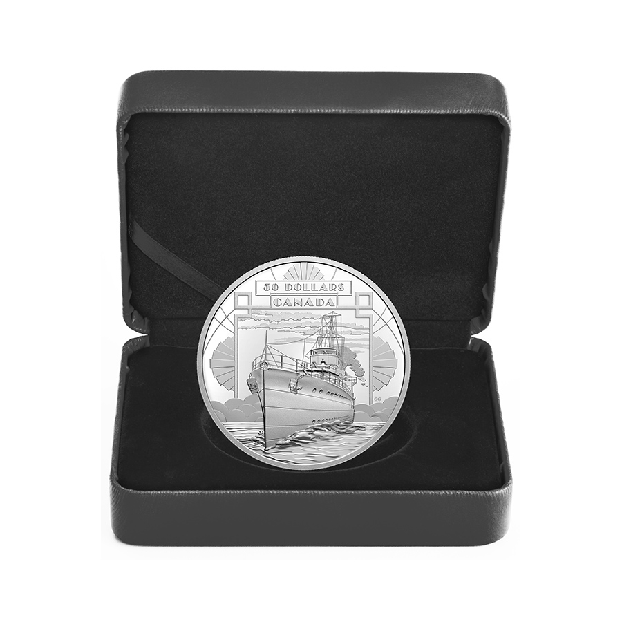 Designed by Canadian artist Glen Green, your coin’s reverse features a symbol of a Canada’s new-found standing on the world stage after the First World War (1914-1918). Art deco elements surround the depiction of HMCS Saguenay; built in 1931, the vessel was one of the first warships built for the Royal Canadian Navy before the naval service’s rapid expansion during the Second World War (1939-1945). The obverse combines five of the effigies that have appeared on Canadian coins since 1867 (clockwise, from top): the first effigy of Her Majesty Queen Elizabeth II by Mary Gillick, with the Latin inscription “ELIZABETH II D·G·REGINA”; the effigy of King George VI by T. H. Paget, with the inscription “GEORGIVS VI D·G·REX”; the effigy of King George V by Sir E. B. Mackennal, with the inscription “GEORGIVS V D·G·REX ET IND: IMP:”; the effigy of King Edward VII by G. W. De Saulles, with the inscription “EDWARDVS VII D·G·REX IMP:”; and the effigy of Queen Victoria by L. C. Wyon, with the inscription “VICTORIA D·G·REGINA”.
