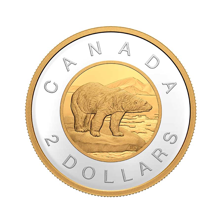 - Selective gold plating. Crafted in 99.99% pure silver, the fine silver coin features a gold-plated inner portion to resemble Canada’s bi-metallic $2 circulation coin, as well as a goldplated rim.