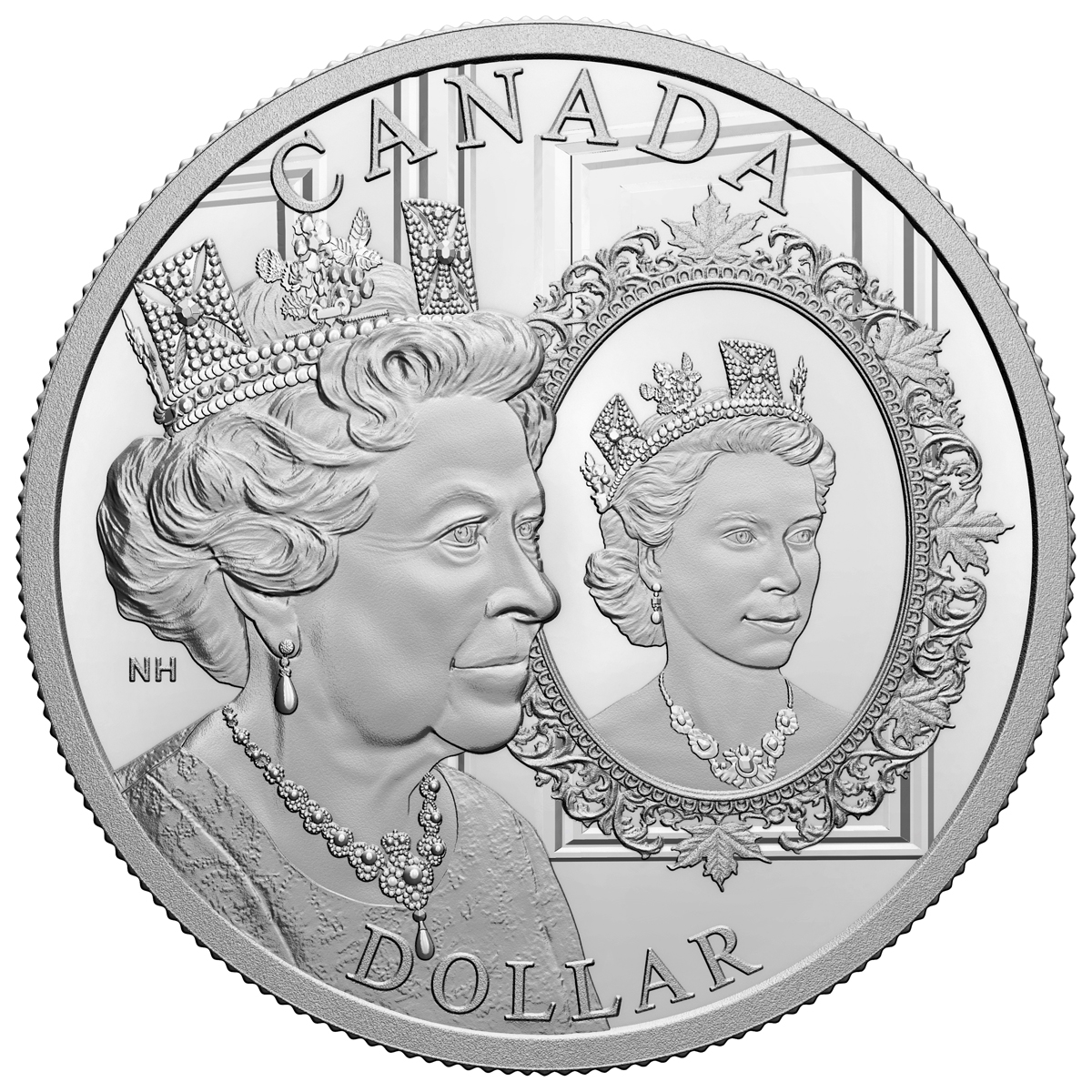 The Platinum Jubilee design features a double portrait of Queen Elizabeth II. In the foreground, Her Majesty is presented in three-quarter view and radiates wisdom gained through her 70-year reign. Next to her is a portrait of her younger self in 1952, shortly after her accession to the throne. The ornate frame includes several maple leaves that serve as an additional tribute to her role as the Queen of Canada. The obverse features the date “2022” and the effigy of Her Majesty Queen Elizabeth II by Susanna Blunt.