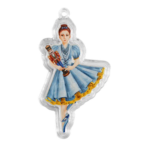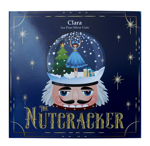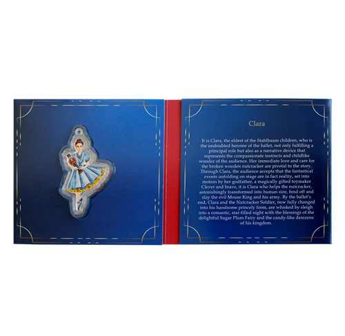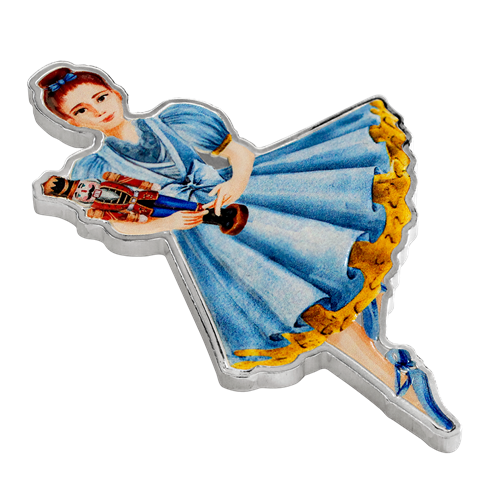 A classic holiday ballet, The Nutcracker is a two-act ballet choreographed by Marius Petipa and Lev Ivanov with a score by Pyotr Ilyich Tchaikovsky. Clara is the undoubted heroine of the ballet. Clever and brave, it is Clara who helps the Nutcracker, transformed into human size, fend off and slay the evil Mouse King and his army. Her grace and resolve is reflected in a 1 oz. pure silver legal tender coin applied with vibrant color and housed in a special ornament-style hanger capsule. A unique keepsake or to adorn a holiday tree!