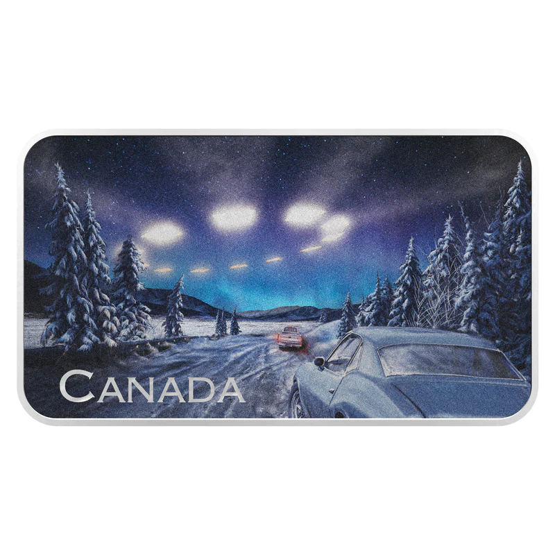 On the night of December 11, 1996, at least 31 people in four different areas of the Yukon reported seeing a UFO in the sky. The bright lights described by the witnesses have been re-created on this rectangular when viewed under natural light. Then turn on the included black light to reveal greater details of a circular craft as envisioned by artist Neil Hamelin. Mintage is limited to 7,500. GST/HST exempt.