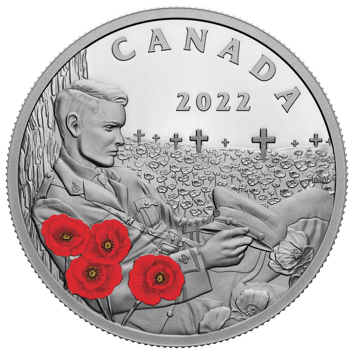 From the great victories and tragic losses of the First World War came our most enduring symbol of service and sacrifice: the red poppy, which is colourfully highlighted on this 2022 Remembrance Day coin. Blooming in the foreground and in the fields of the fallen behind the weary officer, the poppy is a lasting reminder of those who fought and sacrificed everything; of the courage of those who serve; of the consequences of war, and a commitment to peace—lest we forget. Selective colour highlights the poppies that represent hope and eternal life through Remembrance.