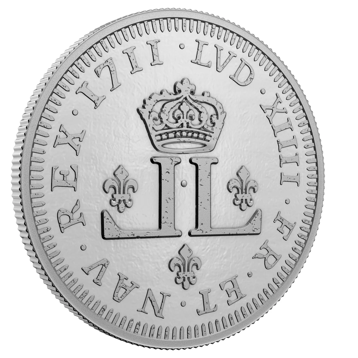 The design on the $50 fine silver coin is a replica of the obverse of the 30 deniers coin, featuring the monogram of the long-reigning King Louis XIV. The design includes two “L’s, one forwards and one backwards under the King’s crown, together with three Fleur-de-lis symbols.