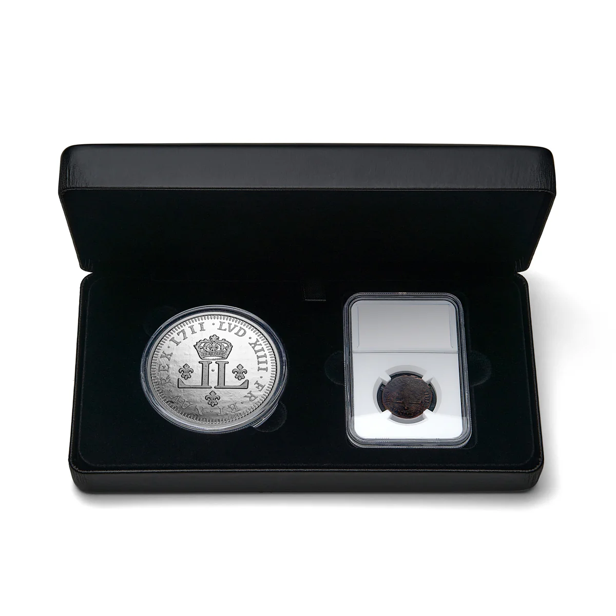 This two-coin set from the Royal Canadian Mint transports us back in time to explore the coinage of Canada long before confederation and even before the era of British North America. It includes a large 2022 $50 five ounce fine silver replica of a 1711 30 denier coin together with a (much smaller) original 1711 coin of the same design. The two coins are presented side by side in a black presentation case, with the original historic coin encapsulated by a third-party authentication service. Mintage is limited to just 1,250.