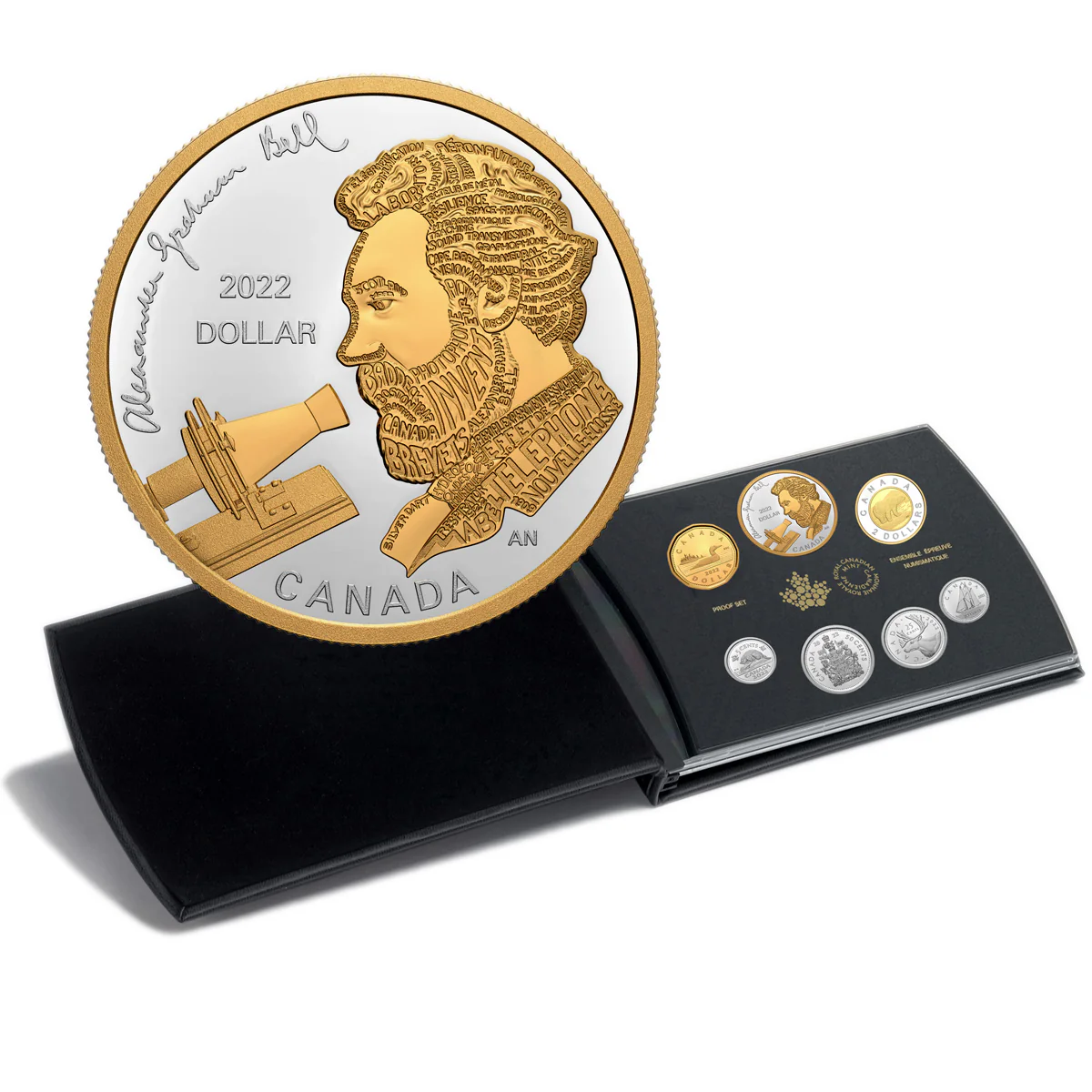 Collect Canada’s highest quality annual coin collection with this 2022 seven-piece fine silver proof set. Presented in a genuine leather folio case, the set features a unique selectively gold plated Alexander Graham Bell commemorative silver dollar, a selectively gold plated $2 coin, a fully gold plated loon dollar, plus the fine silver half dollar, quarter, dime and nickel. This set continues the long tradition of annual Royal Canadian Mint proof sets started in 1971, providing an exceptional annual collection or a prestige gift to mark an important event in 2022.