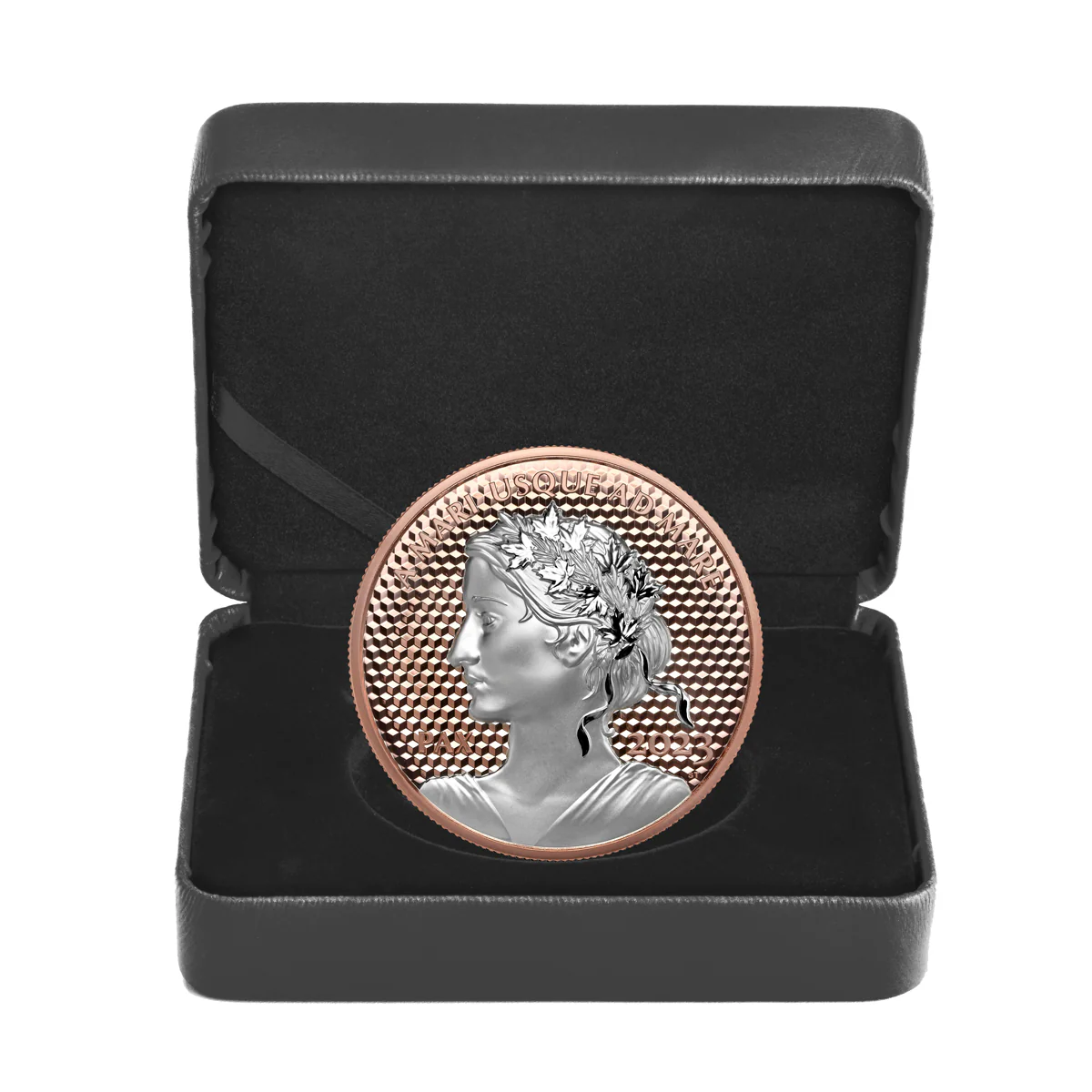The coin features Ultra High Relief with exceptional detail, as well as an innovative and captivating background design. As the coin is moved in the light, the pattern creates a pulsating effect which accentuates the design of Peace figure. Lady Peace also stands out in brilliant silver, contrasting from the background which is layered in rose gold.