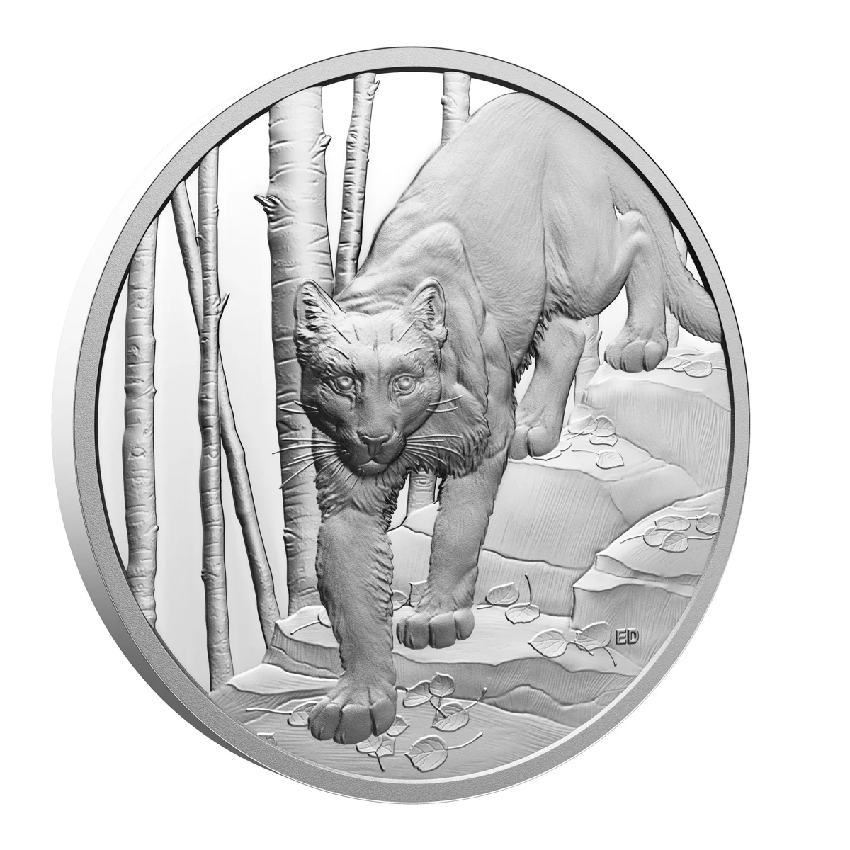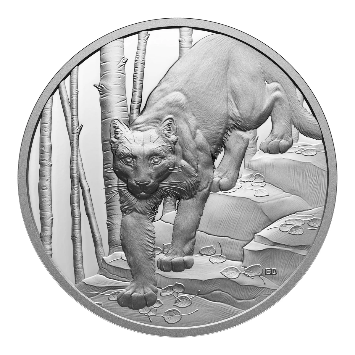 The reverse design is a close-up encounter with the cougar in its natural element. The predator’s unwavering gaze locks eyes with the viewer as it prowls silently down a rocky incline blanketed by fallen leaves. The trembling aspen trees in the background evoke the serene yet dangerous beauty of Canada’s wilderness, where the cougar reigns supreme. Emily Damstra’s intricate engraving captures every element with stunning clarity, from the cougar’s muscular frame to the subtle movement in its surroundings.