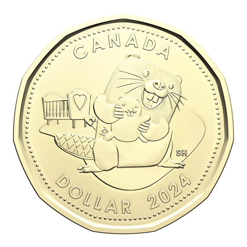 The centerpiece of the 2024 Baby Gift Card Set is the uniquely crafted $1 coin, featuring a lively and endearing design by acclaimed Canadian artist Steve Hepburn. The reverse side showcases an enchanting nursery scene with a joyous beaver parent standing proudly next to a crib, cradling an utterly adorable baby beaver (or kit). This heartwarming depiction perfectly captures the joy and innocence of a newborn’s arrival. On the obverse side, the coin proudly displays the effigy of His Majesty King Charles III, skillfully rendered by Canadian artist Steven Rosati.