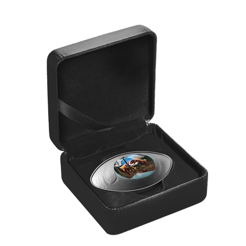Your coin is encapsulated and presented in a black Royal Canadian Mint-branded clamshell with a black beauty box.