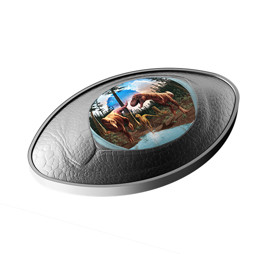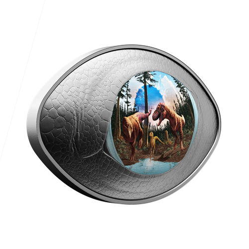 - A realistic dinosaur eye. Shaped like a tyrannosaur eye, this 99.99% pure silver coin transports you back in time to when dinosaurs roamed the earth!