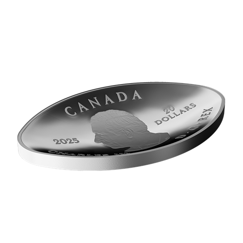 Travel back to an age when dinosaurs ruled the Earth and see the world as they saw it! With each new fossil discovery, paleontologists are able to piece together new information about what the world looked like millions of years before us, and this oval-shaped coin presents a view of that long-gone reality. Its oval outline is perfectly shaped for an extreme close-up of the eye (and scaly eyelid) of Thanatotheristes, the most ancient Canadian tyrannosaur and the top predator of its time. For another view of this species, take a closer look at the colourful reflection in the eye—you’ll notice that this fearsome two-legged carnivore wasn’t travelling alone.